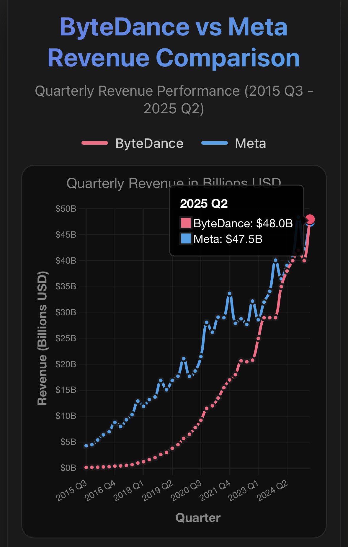Bytedance for the first time in history has crossed meta in revenue. And this is without being present in India. For those who dont know this is the parent company of tiktok.