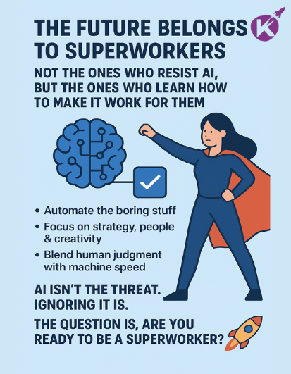 The future belongs to Superworkers. Not the ones who resist AI, but the ones who learn how to make it work for them. The real power? ✅ Automate the boring stuff ✅ Focus on strategy, people & creativity ✅ Blend human judgment with machine speed AI isn’t the threat. Ignoring it is. The question is, are you ready to be a Superworker?