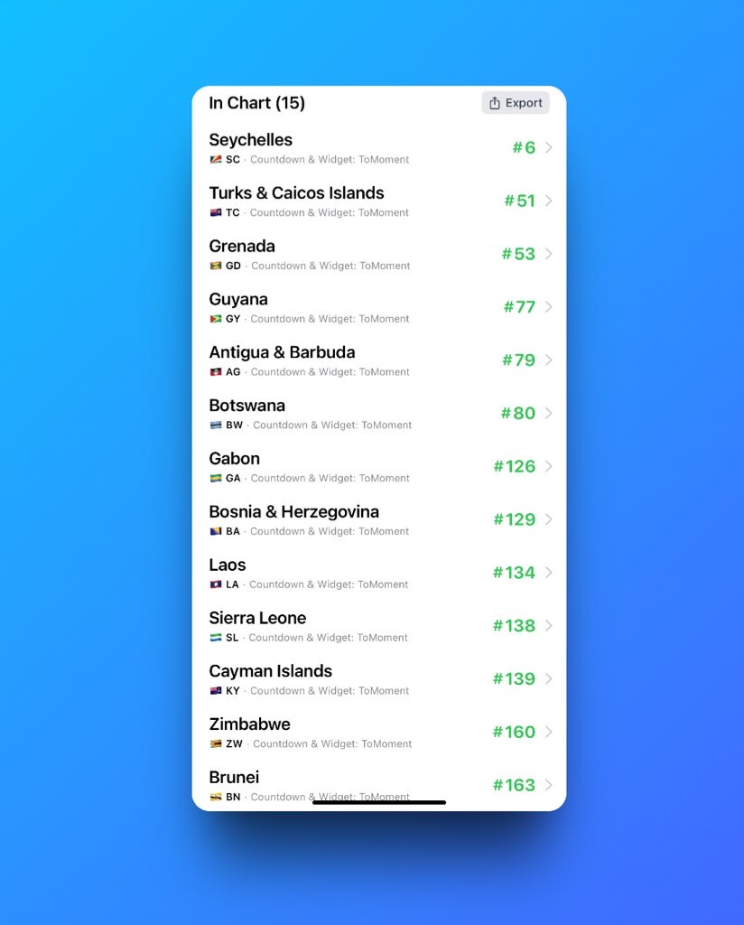 🚀 My countdown app just climbed charts in 15 countries! The market is super saturated, so I experimented with making the lifetime deal free for a while — looks like the strategy is working Let’s see if it helps the app once the offer goes down.