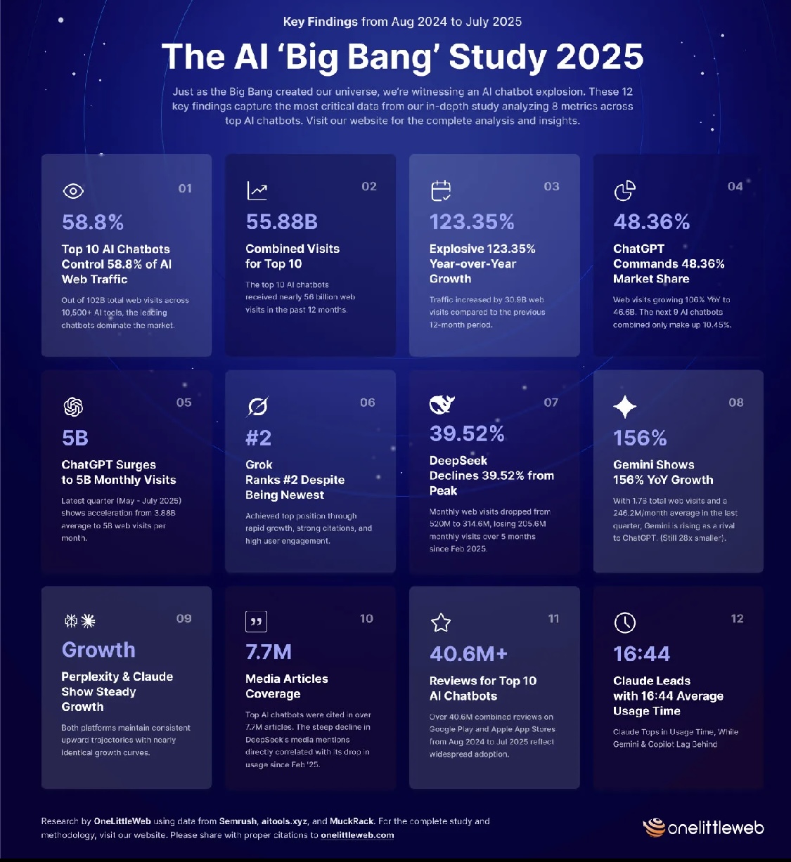According to the AI Big Bang Study 2025, chatbot traffic has more than doubled in a year, jumping 123% year-over-year and now accounts for over half the total traffic among AI tools. The top 10 chatbots (from ChatGPT to Grok to Gemini) now pull in nearly 56 billion visits. 1) ChatGPT leads with almost 48% of all AI tool traffic. 2) Grok is the breakout star, surging from tens of thousands to nearly 700 million visits which is a staggering gain. 3) Other names like Gemini and Claude are also growing fast and showing strong user engagement. It’s clear that AI chatbots are becoming the entry point to the internet for millions, reshaping how we search for, discover, and interact with information.