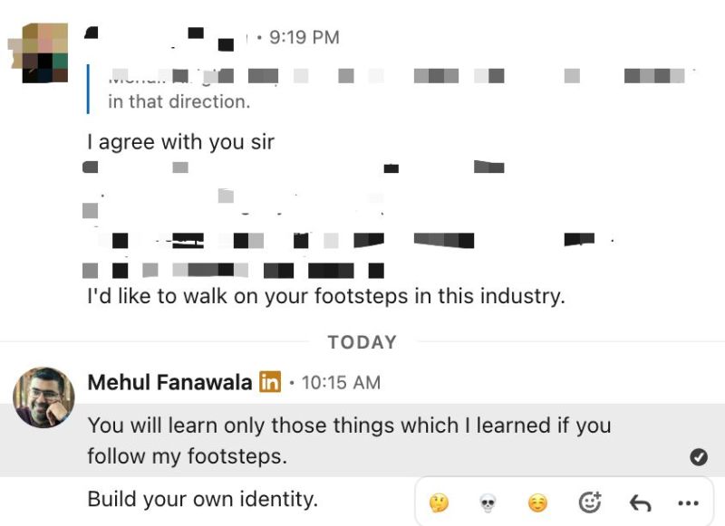 I got a DM recently that said: “I’d like to walk in your footsteps in this industry.” My reply? “You will only learn the things I’ve learned if you follow my footsteps. Build your own identity.” And here’s why I said that. When you try to walk som