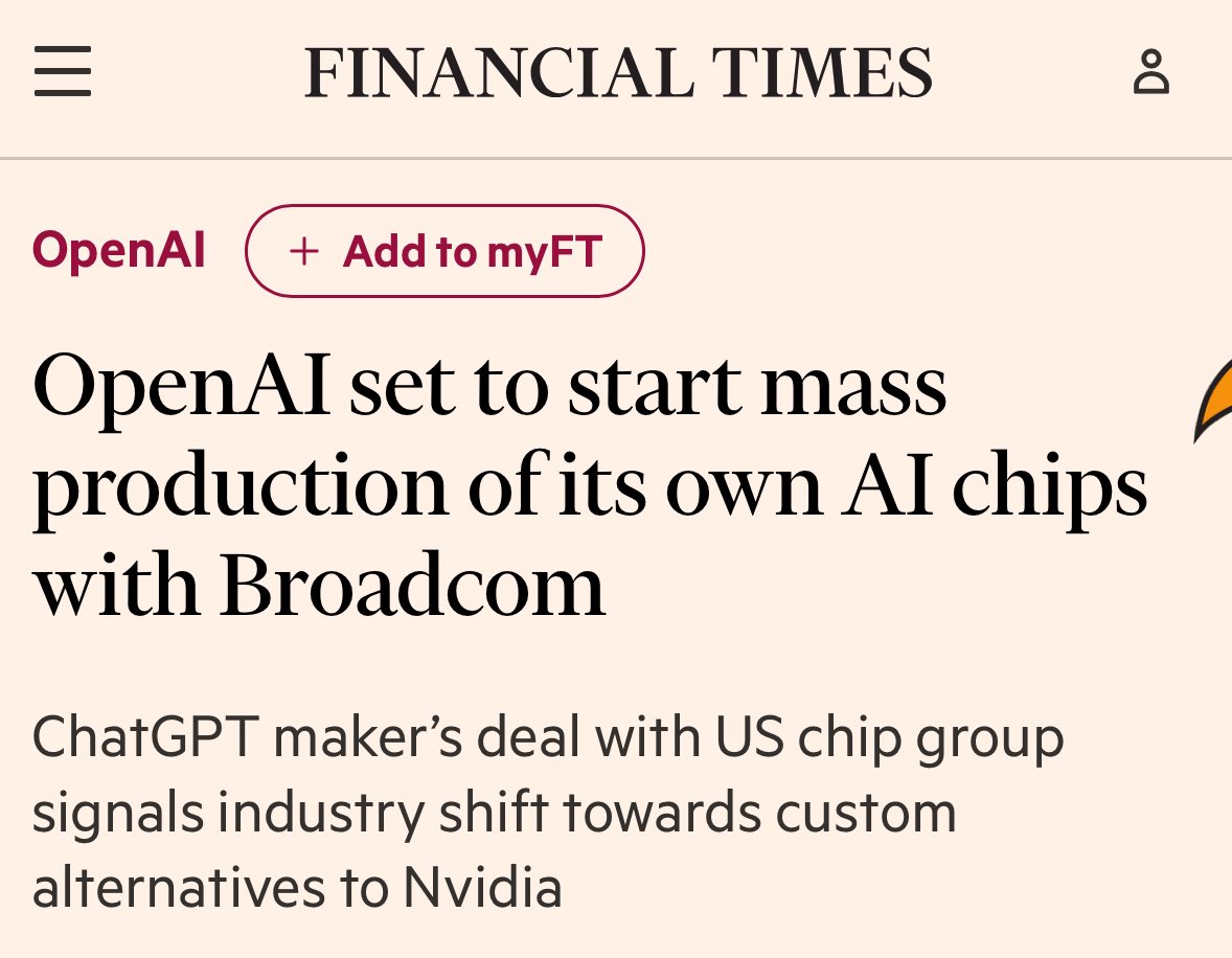 Big AI move today : OpenAI is teaming up with Broadcom to roll out its own in-house AI chip by 2026. This means faster models, cost control, and less reliance on Nvidia. It’s not just infrastructure. It’s the AI equivalent of owning your energy g