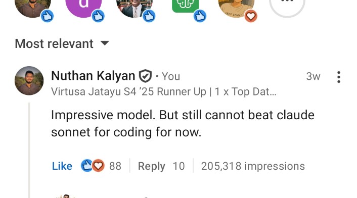 i really didn't expect that I would get 200k impressions for my comment on linkedin post 😂. btw which model do you think is best now for coding?