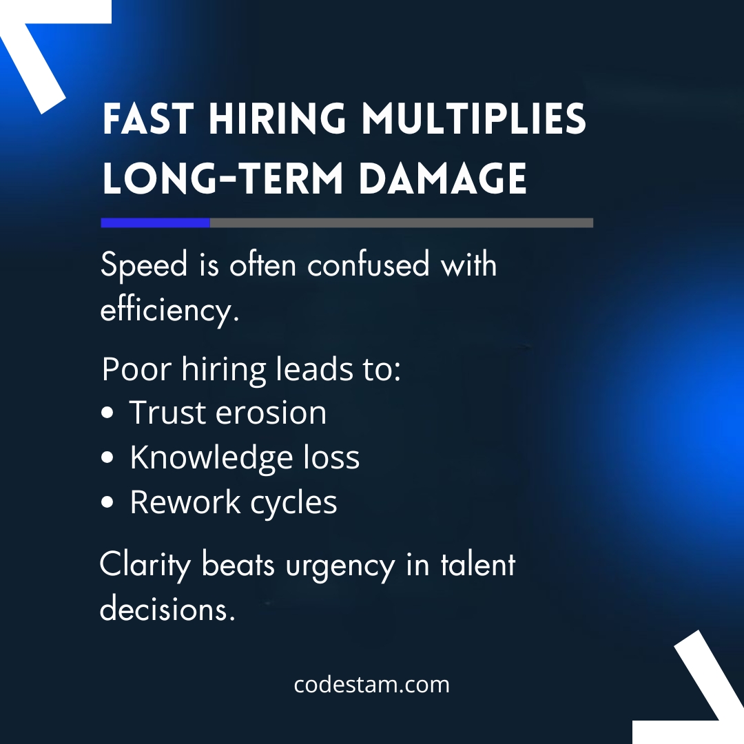 Fast hiring often feels efficientโbut speed without clarity is costly. Rushed talent decisions quietly compound damage over time: โข Trust slowly erodes โข Knowledge walks out the door โข Teams get stuck in rework loops Urgency solves short-term press