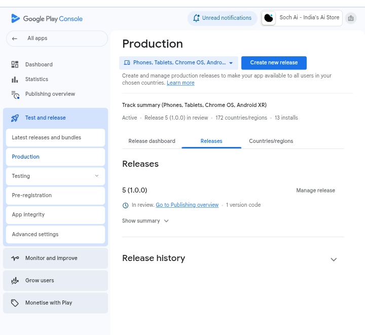 We have successfully uploaded our application Soch Ai on Google Play Store. Currently, it is in the production rollout phase and under Google’s review process. Once the review is completed and approved, the app will be available publicly for users t
