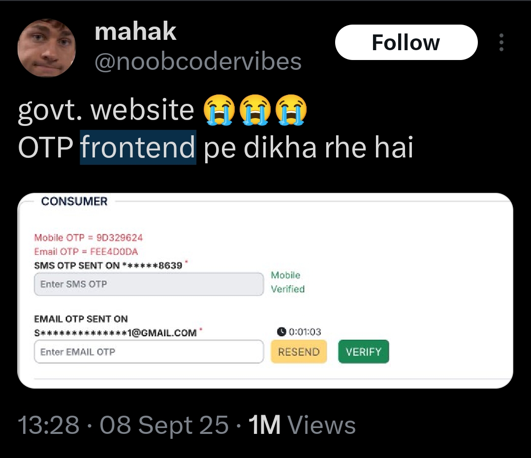 Breaking News: Govt Website Levels Up Security! 😱 OTPs now served fresh on the frontend - no need to check your phone or email! Tag a dev friend who’d love this ‘innovation’! 😂 ---- Image via Mahak, on X.