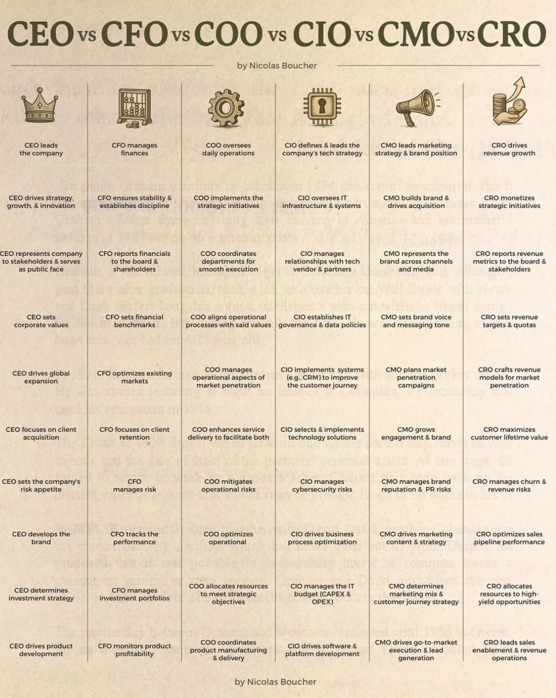 C-Suite! CEO vs CFO vs COO vs CIO vs CMO vs CRO by Nicholas Boucher