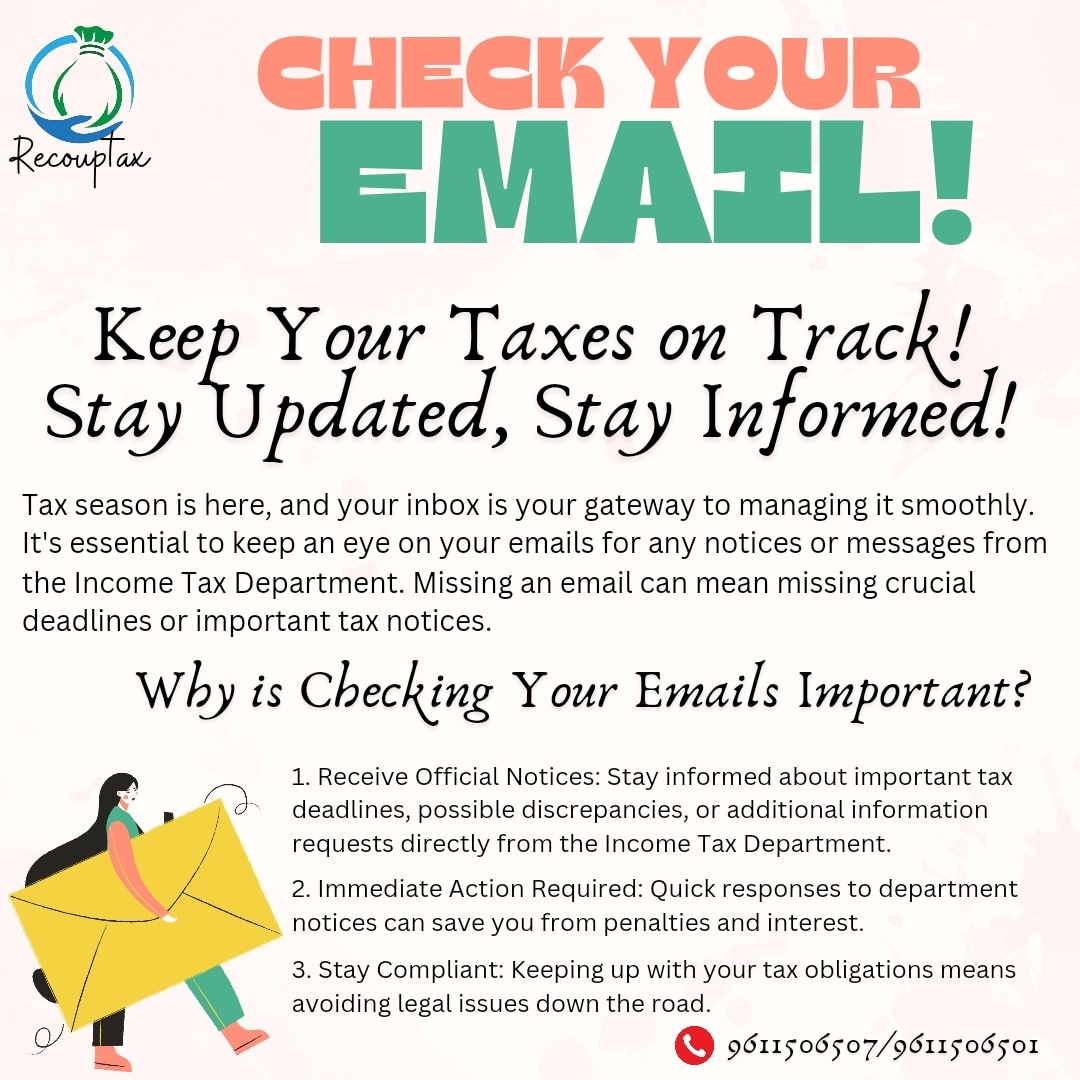 Attention: Please Check Your Emails This is a gentle reminder to regularly check your email for any communication related to Income Tax. Do not ignore or delay responding to such messages, as failure to act on time may lead to heavy penalties, intere