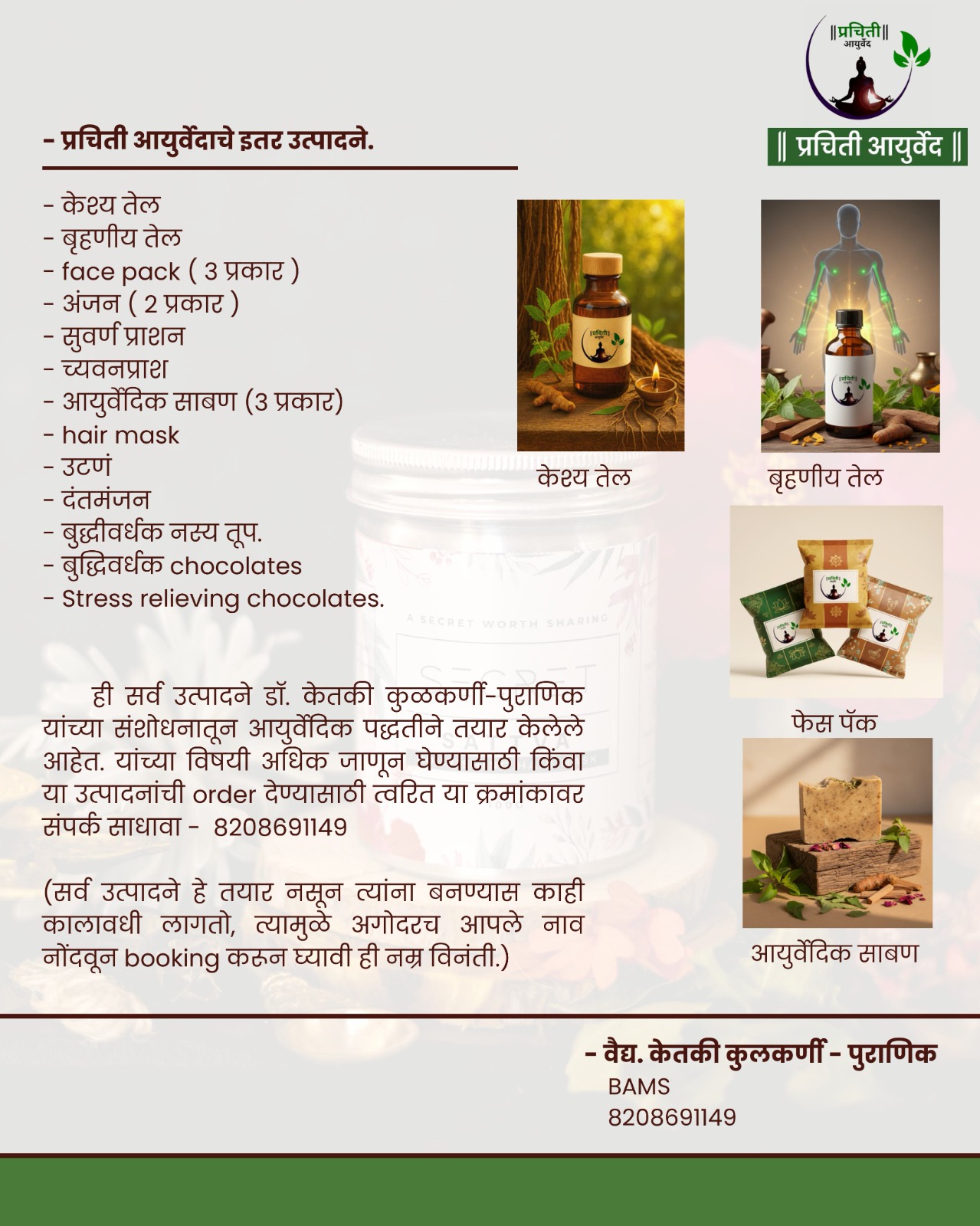 🌿 ✨ Prachitee Ayurveda ✨ 🌿 Experience the Power of Authentic Ayurveda At Prachitee Ayurveda, every product is more than wellness – it’s the essence of Ayurvedic experience. As the name says – without Prachitee (Experience), you won’t believe the effects! 🌸 ✅ 100% Ayurvedic Formulations ✅ Backed by Research ✅ Crafted by Dr. Ketki Kulkarni-Puranik (BAMS) 🌿 💚 Our Products: 🪔 Herbal Oils | 💆♀️ Face Packs | 🧼 Soaps | 🍯 Suvarnaprashan | 🍫 Stress-Relief Chocolates | 🌸 Daily Essentials (Uṭṇa, Dantmanjan & more) 💡 Ayurveda isn’t just treatment – it’s living in harmony. ✨ Once you experience it, you’ll believe it! 📲 Call: 8208691149 💥 Use my referral for priority access + exclusive offers! 🎁 ✨ Let Ayurveda not just be a concept – let it be your Prachitee🌿
