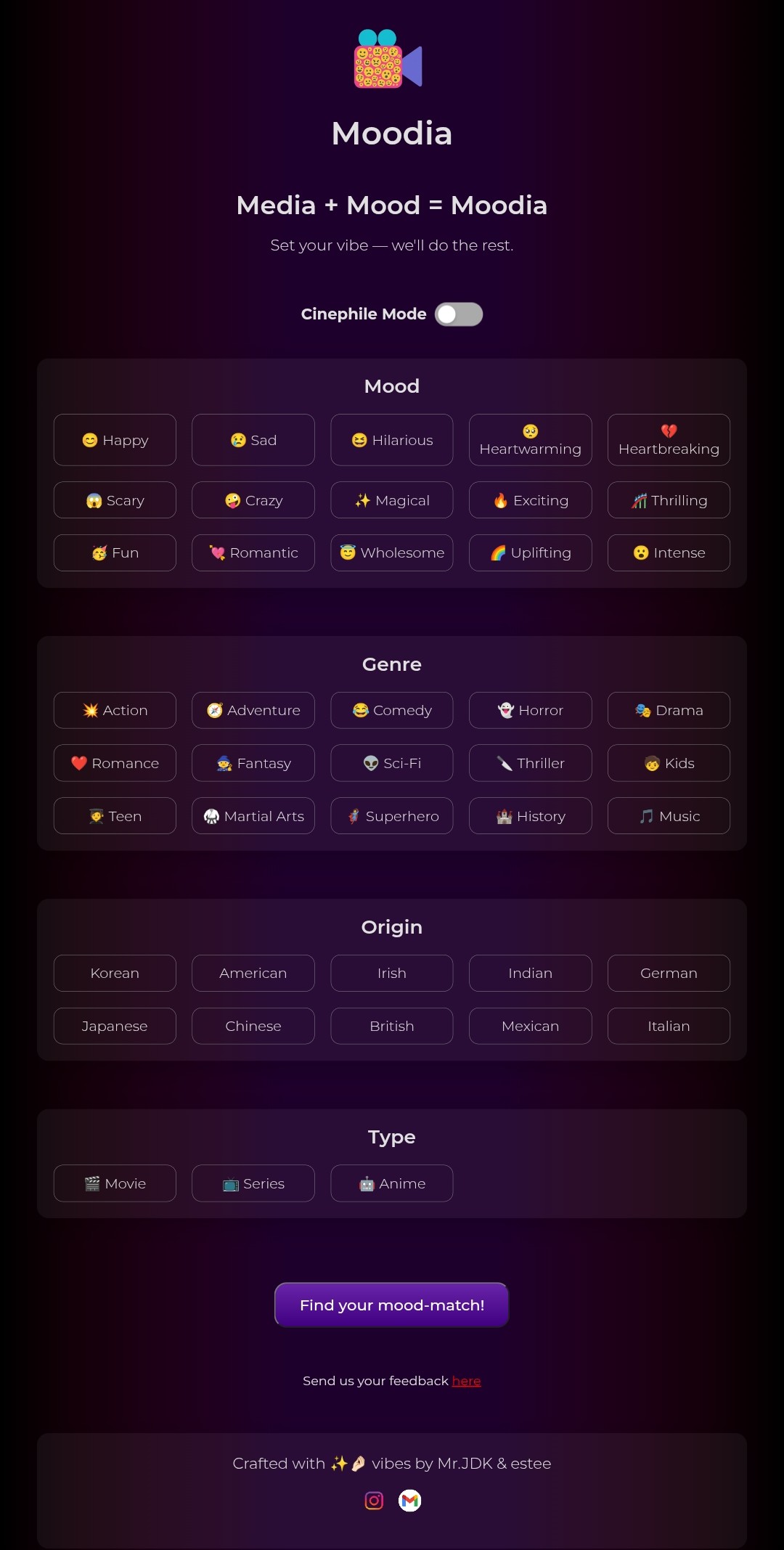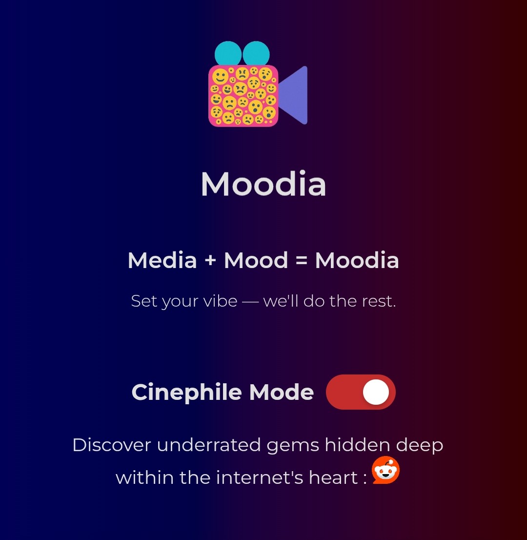 Hey! 🎬 Built Moodia (Media for your mood) (moodia.netlify.app) last weekend—Free movie, series, anime recommendations in 3 steps! Cinephile mode finds Reddit’s hidden gems, 95-100% on-point with Rotten Tomatoes/IMDb data. Quick synopsis to pick fast