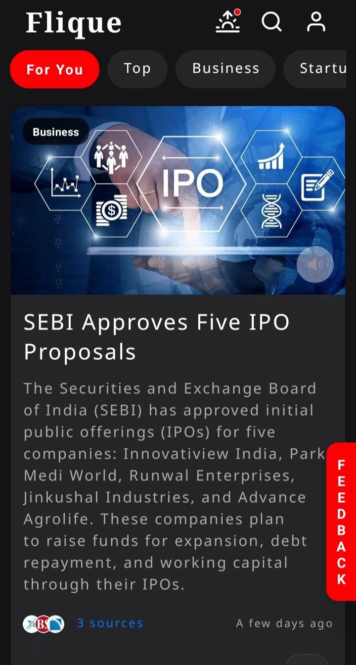 ๐ซฐSEBI Approves Five IPO Proposals The Securities and Exchange Board of India (SEBI) has approved initial public offerings (IPOs) for five companies: Innovatiview India, Park Medi World, Runwal Enterprises, Jinkushal Industries, and Advance Agrolife. These companies plan to raise funds for expansion, debt repayment, and working capital through their IPOs. #Flique #Fliquenews