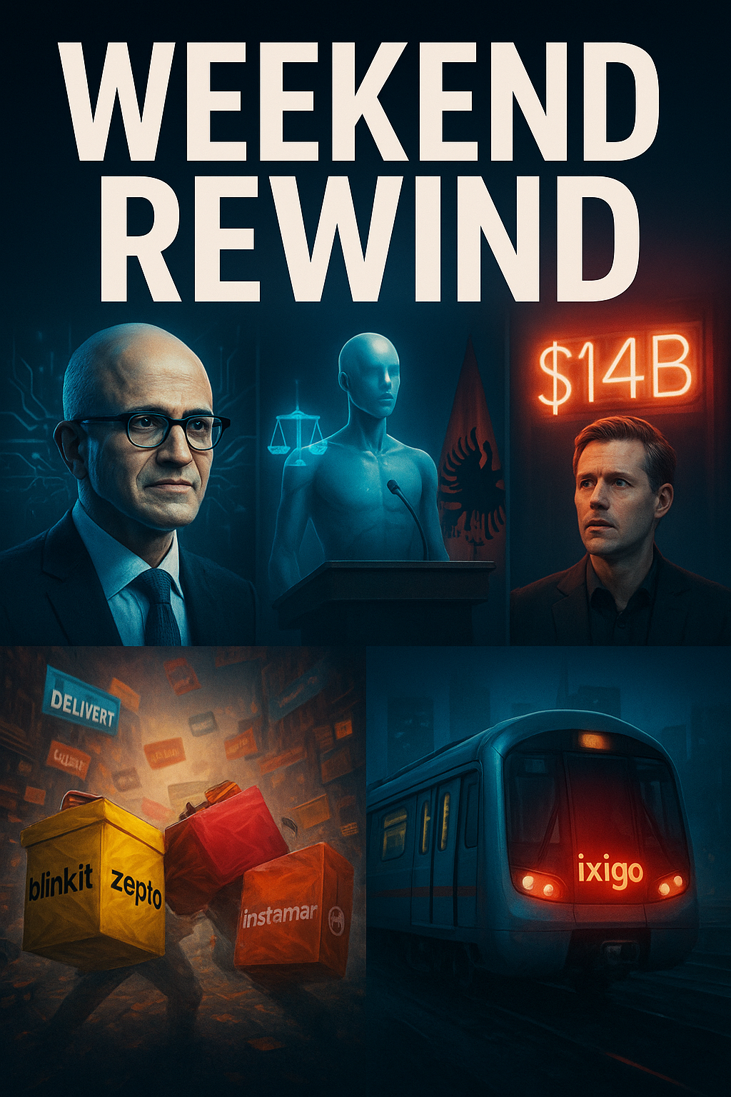 The last 72 hours moved fast. "I stare at the news and it stares back." Here’s your weekend rewind ⬇️ 1. Microsoft flexed 💪🏻 — billions into in-house AI, while letting OpenAI roam just enough to look free. Control > dependence. 2. Albania’s AI-Minister debuted 🤖— the world’s first AI “minister,” pitched as a weapon against corruption. Symbol and signal. 3. Klarna humbled 📉 — a $14B valuation haircut reminded unicorns that cash flow trumps hype every single time. 4. Q-commerce war ⚔️ — Blinkit, Zepto, Instamart weaponized checkout screens into ad battlegrounds. Festive season = burning budgets. 5. Ixigo expands 🚇— now selling Delhi metro tickets. Small tickets, but big moat strategy. The chase for growth is now disguised as convenience, and convenience has become the most expensive battlefield in business. Weekend’s done. The fight isn’t. Who do you think played it smartest? 🔥