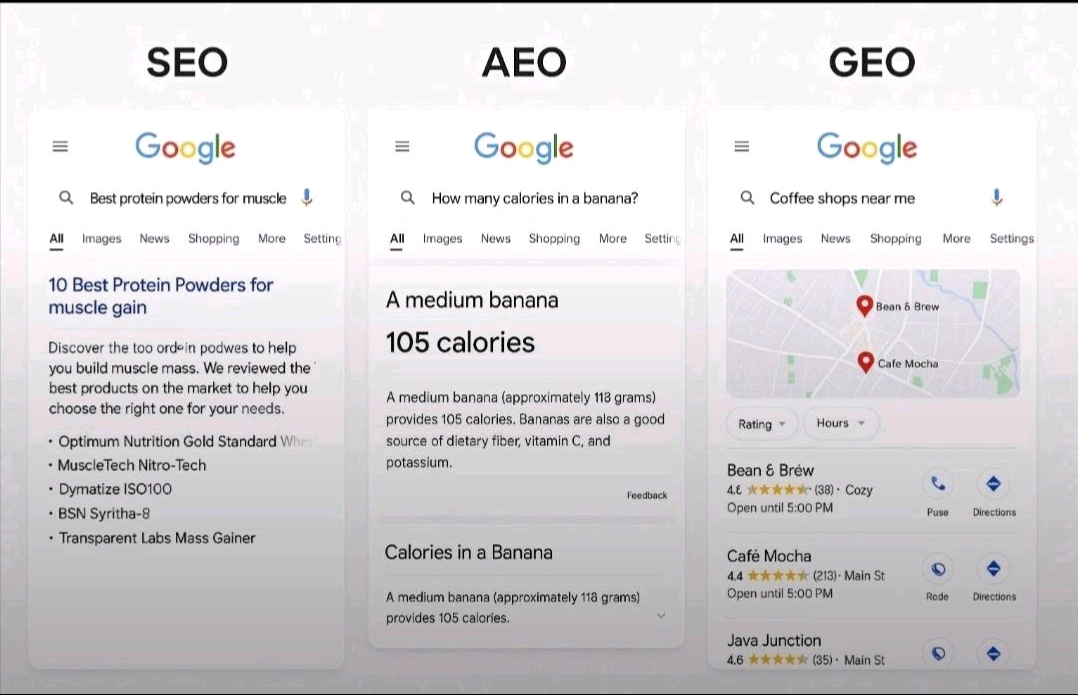 SEO ๐ | AEO โ๏ธ | GEO ๐ โ One size doesnโt fit all! Optimize for the right intent and win every click. โ๐ Letโs break it down: 1. SEO (Search Engine Optimization) When users ask โBest protein powders for muscle,โ theyโre looking for: Reviews C