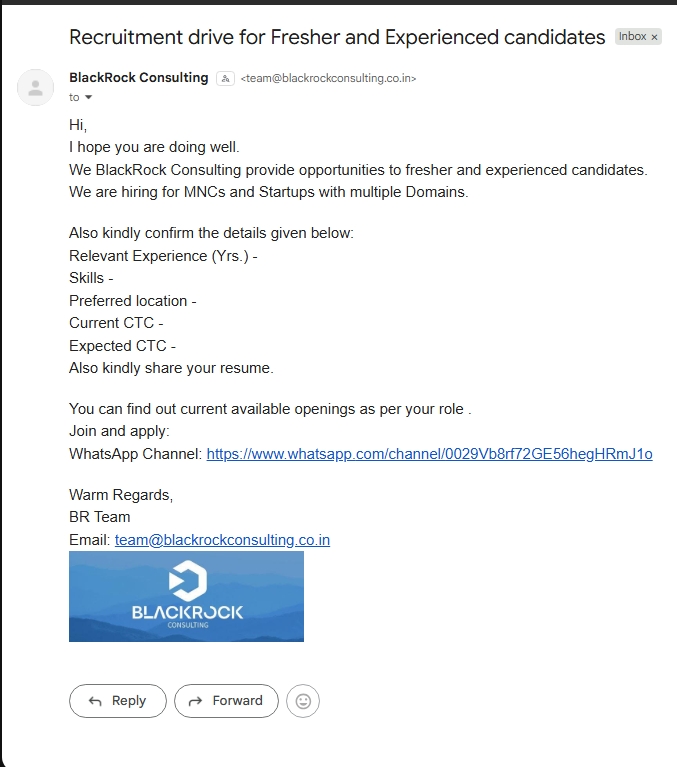 I recently got an email from someone claiming to be “BlackRock Consulting” offering jobs for freshers & experienced folks. But it had several red flags: Sent from a .co.in domain, not the official BlackRock domain Generic message, no specific role, no personalization Asking for current & expected CTC upfront Wants you to apply via WhatsApp As startup / tech people, we often get unsolicited offers. But please always verify job offers: check the official company site, don’t share sensitive info until you’re sure, don’t trust applications pushed via casual channels like WhatsApp if everything else looks too informal. I’m sharing this so others in Medial’s community can stay alert. 🚀