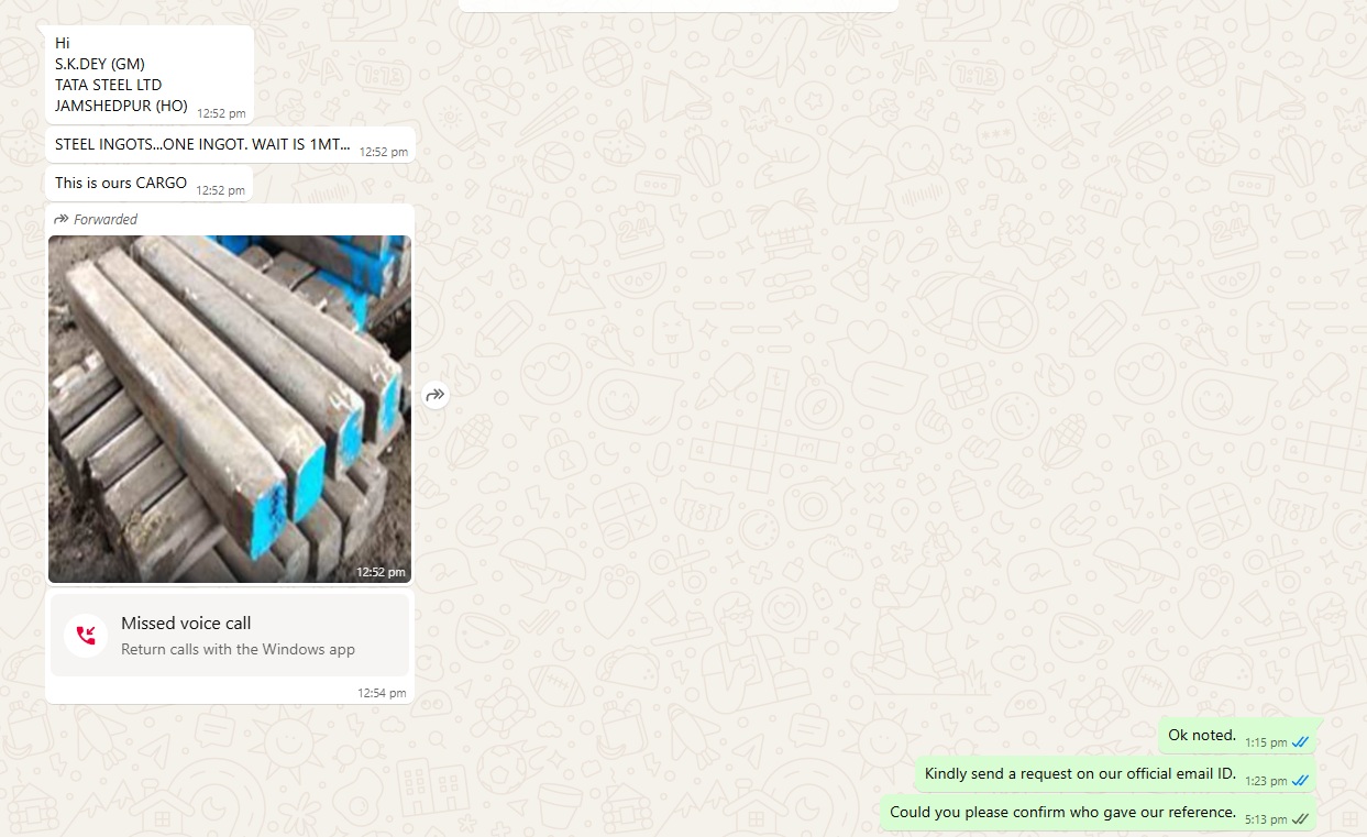 Exact Same thing happened to us, Someone claiming to be Mr. S. K. Dey had Called and discussed with exact same details over telecom yesterday. Trade should use caution about Such queries.