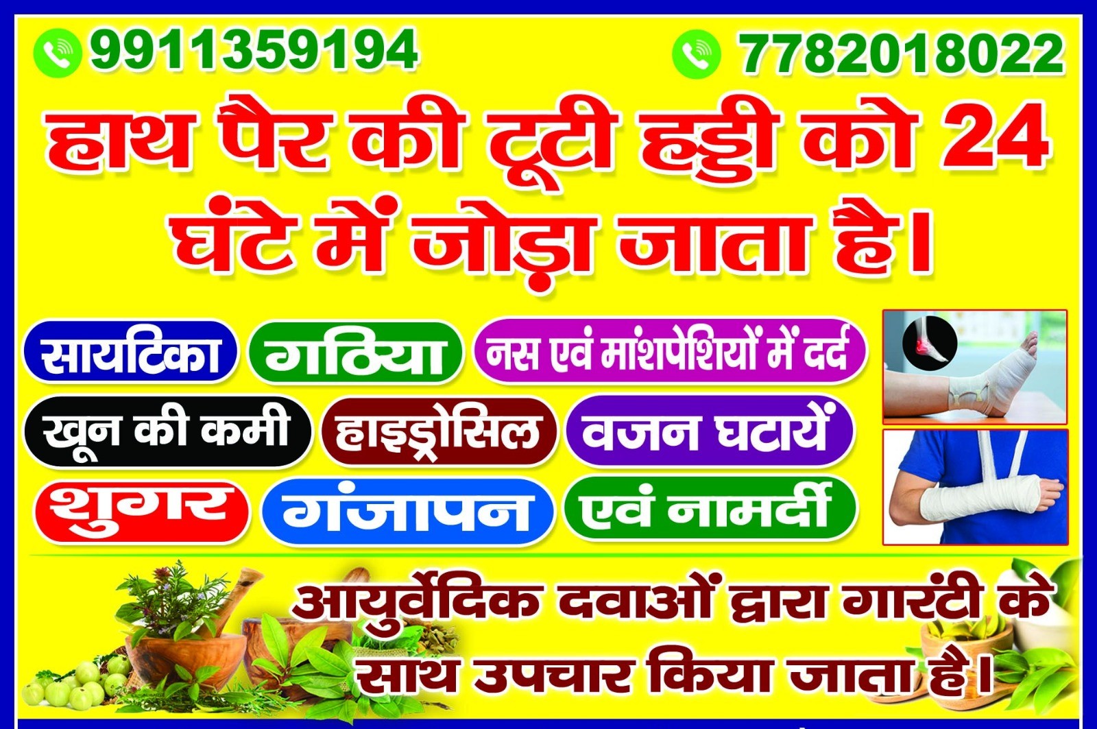 हाथ - पैर की टूटी हड्डी को आयुर्वेदिक लेप लगाकर 24 घंटे में जोड़ा जाता है। घुटने में कार्टिलेज का निर्माण, ग्रेसिंग और हड्डियों की मरम्मत 100% गारंटी से की जाती है। सायटिका, सर्वाइकल, रीढ़ की हड्डियों का घिसना, नसों का दबना, वर्टेब्रल कॉलम का खिसकना