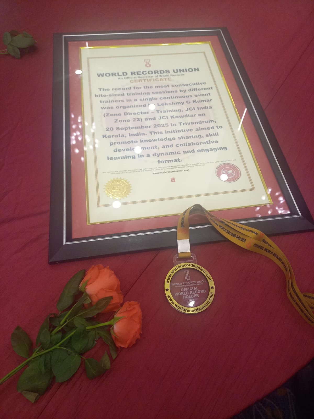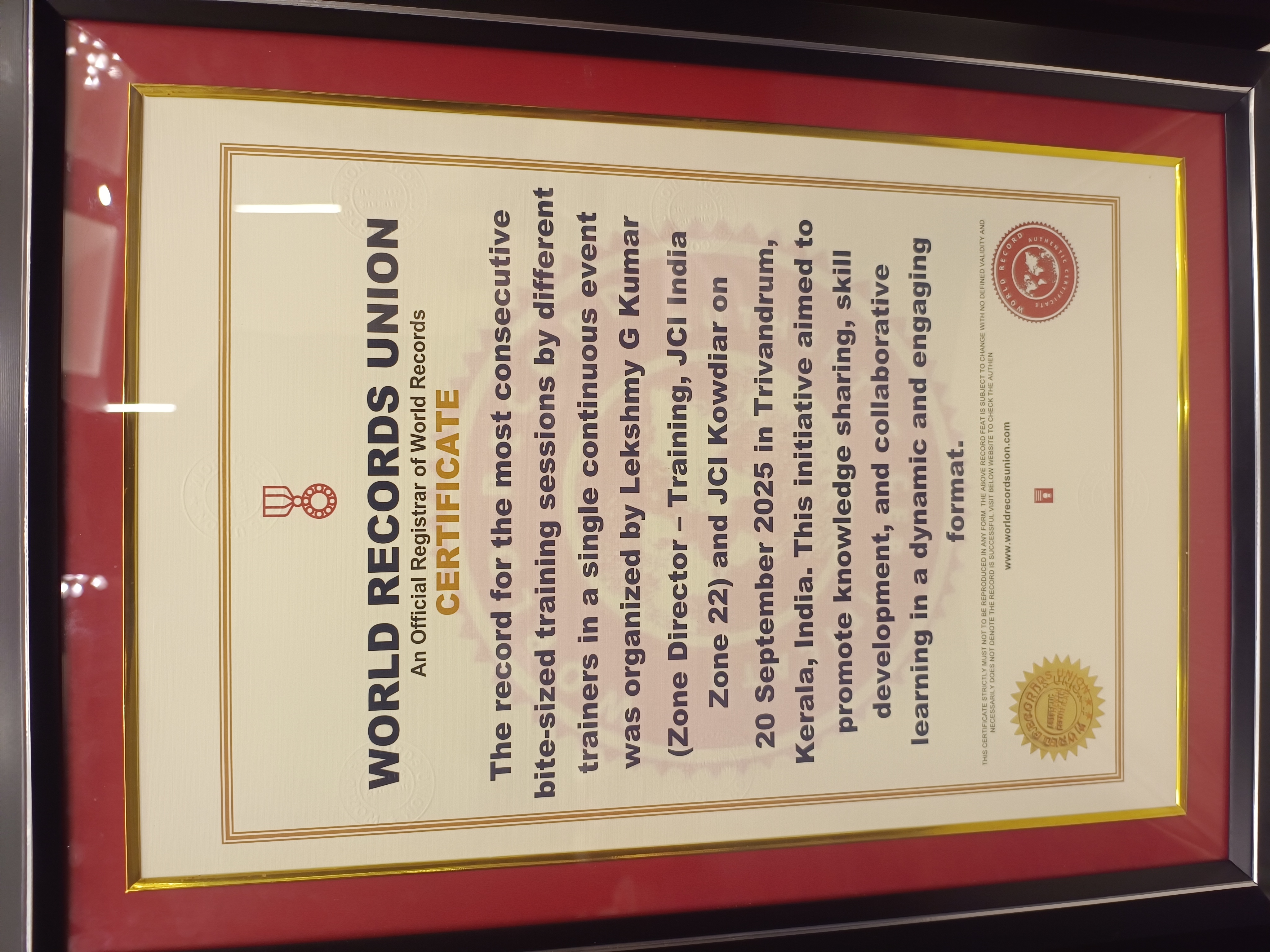 WE DID IT! JCI Kowdiar Creates a World Record! ๐ As President of JCI Kowdiar, I am proud to share that we have officially set a World Records Union record for the most consecutive bite-sized training sessions by different trainers in a single continuous event! This milestone, achieved through our mega training marathon Lekshya, is a testament to the power of knowledge sharing, collaboration, and vision. Special thanks to JCI Sen. Lekshmy G. Kumar for her inspiring leadership and to JCI Sen. Abraham Kurumthottikkal, Program Director of Lekshya, for steering this to success. And above all, gratitude to every trainer, participant, and team memberโthis record belongs to you all. Hereโs to more empowerment, inspiration, and history-making together!