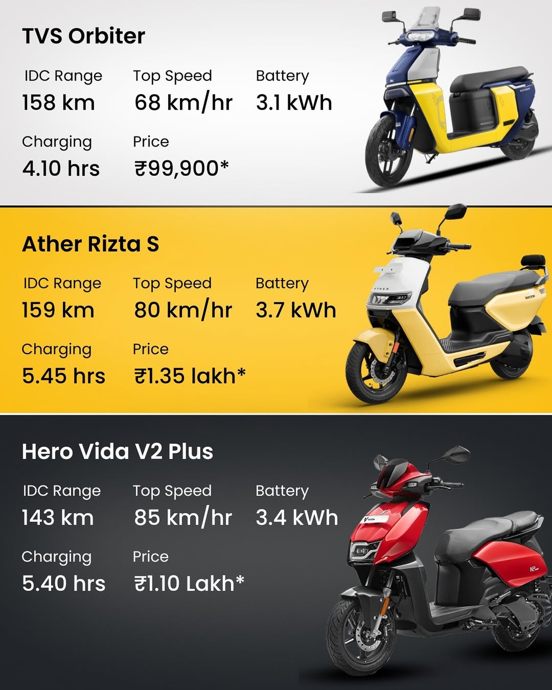 THE EV SHOWDOWN! Three big names. Three power-packed choices. ā” From TVS Orbiterās budget-friendly punch to Ather Rizta Sās performance edge and Hero Vida V2 Plusās speed factor ā which one would you ride home?