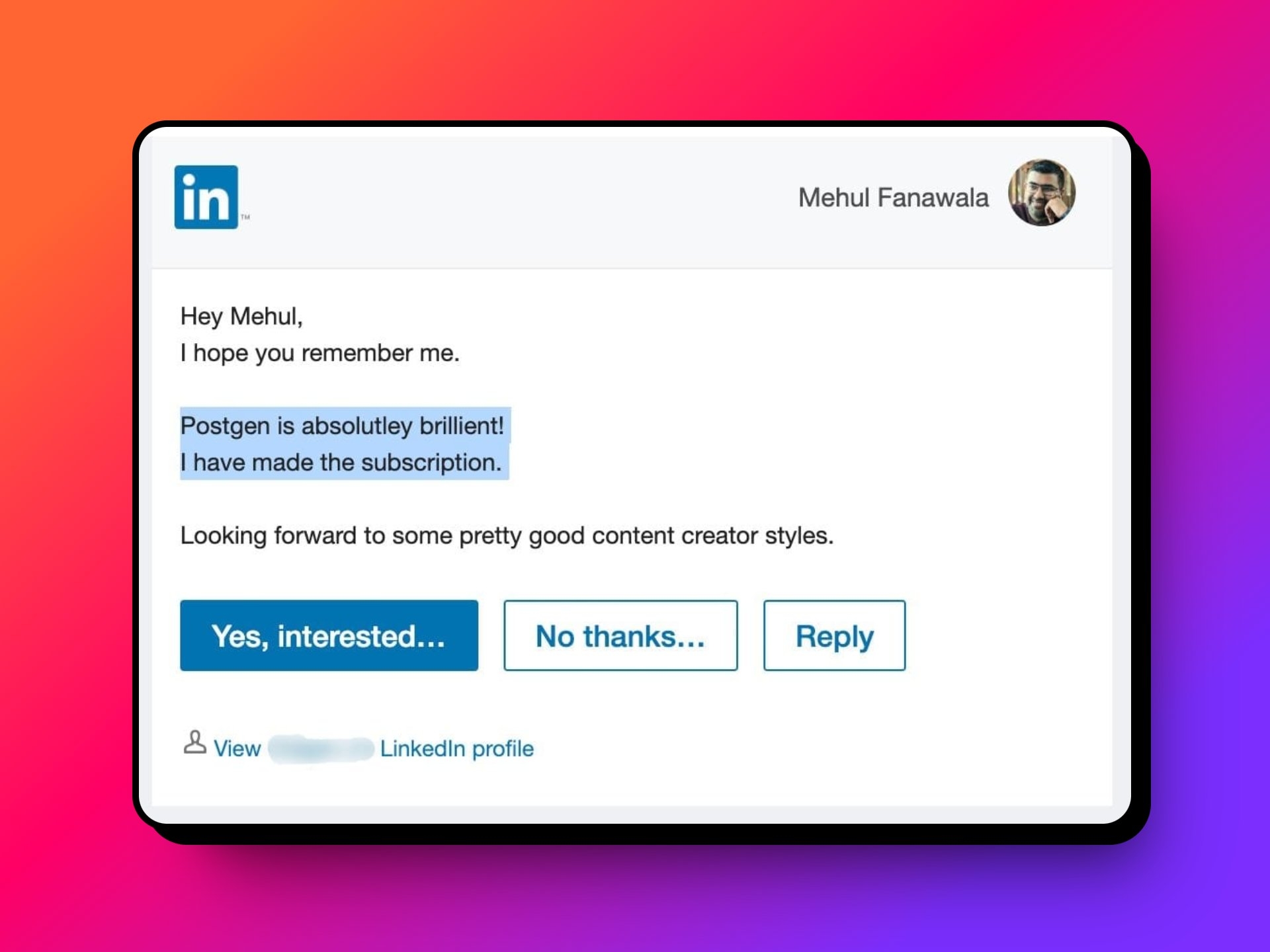 Woke up today to the BEST Monday DM: "postgen is absolutely brilliant! I have made the subscription." These moments remind me why I love what I do. 1. Seeing such messages makes my day 2. Seeing people create and grow their personal brand 3. Shari