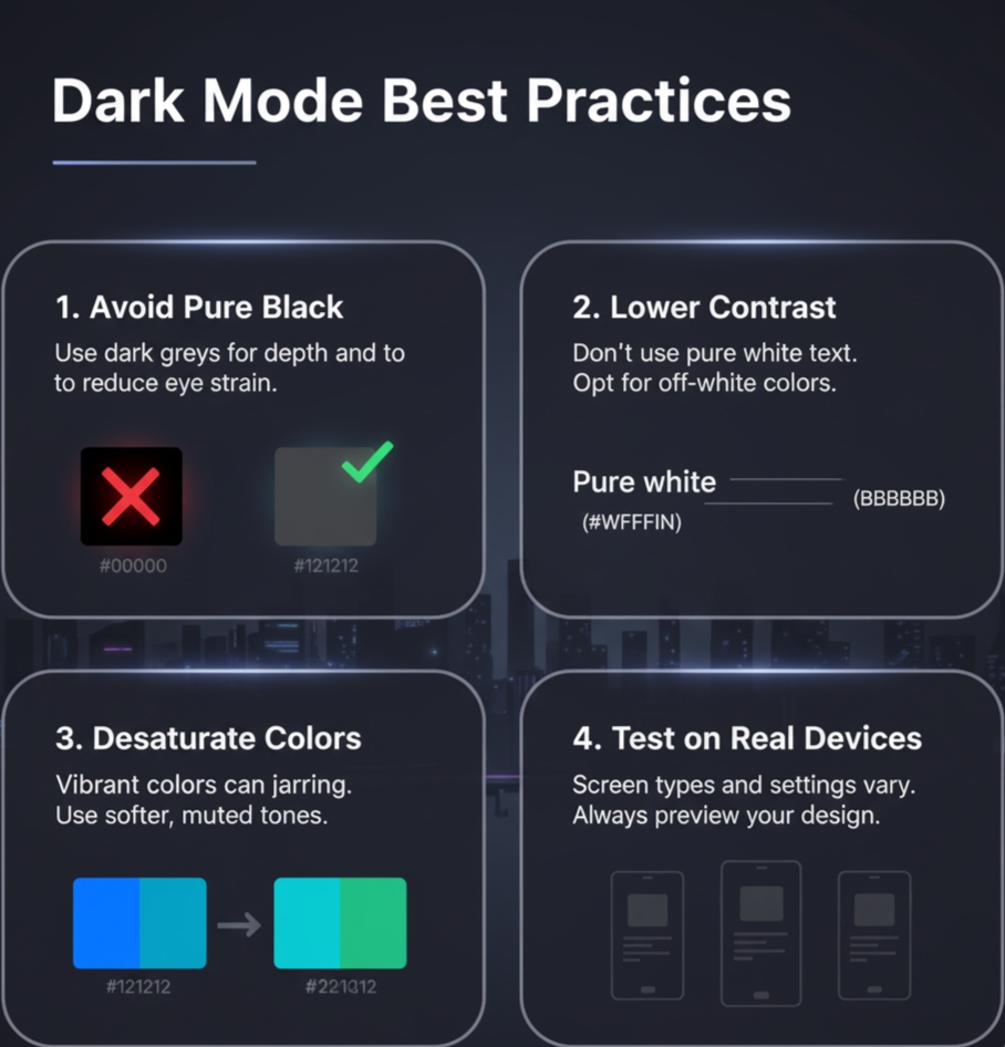 Designing for Dark Mode? 🌑 Avoid pure black & white, desaturate colors, and always test on real devices for a comfortable UI experience.❇️