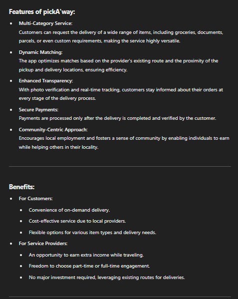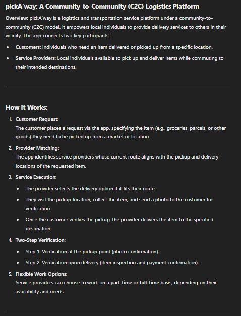 pickA'way: A Community-to-Community (C2C) Logistics Platform Overview: pickA'way is a logistics and transportation service platform under a community-to-community (C2C) model. It empowers local individuals to provide delivery services to others in t