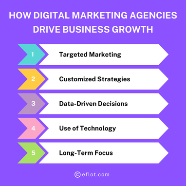 How Digital Marketing Agencies Drive Business Growth - Eflot A Digital Marketing Agency in Bangalore helps businesses grow by using smart online strategies to increase visibility, attract the right customers, and boost sales. These agencies focus on areas like SEO, social media, content marketing, and paid ads to create tailored campaigns that deliver real results. By analyzing data and customer behavior, they ensure businesses reach their target audience effectively, build strong brand awareness, and achieve faster growth in today’s competitive market. https://eflot.com/digital-marketing-agency-in-bangalore