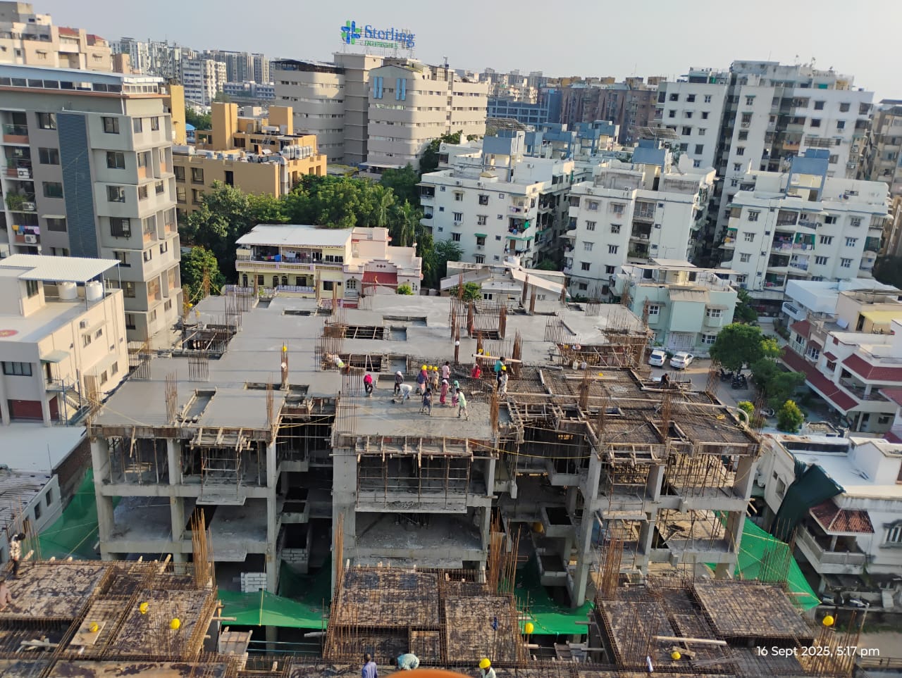 Construction Site: The primary focus is a large, multi-story building under construction. Multiple Levels: Several floors are visible, with the concrete slabs for upper levels already poured or in the process of being poured