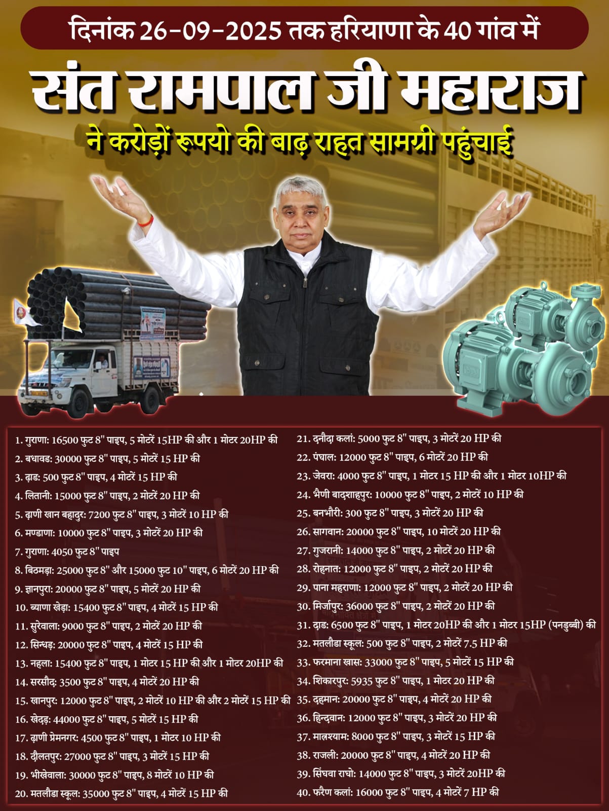 भरोसे का बढ़ता कारवाँ गुराना से शुरू हुआ भरोसे का कारवाँ बधावड़, ढाड़, लितानी से होता हुआ अब ढाणी खानपुर बहादुर पहुँच चुका है। हर गाँव की कहानी इस विश्वास को और मज़बूत कर रही है कि संत रामपाल जी महाराज के रूप में उन्हें एक सच्चा मददगार #अन्नपूर्णामुहिम_किसानोंकेलिए वरदान #Haryana #SewaBy_SantRampalJi #flood #floodrelief #flooding #farmer #AnnapurnaMuhimSantRampalJi #SupremeGod #KabirIsGod ✰वह कौनसा मंत्र है जिसके जाप मात्र से हमारे सभी पाप कर्म नष्ट हो जाते हैं?✰ अवश्य पढ़ें पवित्र सद्ग्रंथों पर आधारित संत रामपाल जी महाराज द्वारा लिखित पुस्तक *ज्ञान गंगा*। निःशुल्क पुस्तक प्राप्त करने हेतु अपना नाम, पूरा पता, और मोबाइल नंबर हमें व्हाट्सएप करें : +91 7496801825