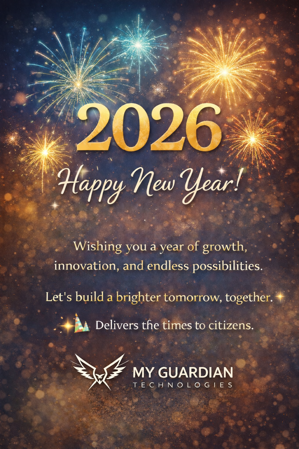 "Delivering the times to citizens." 🏙️ Our mission remains the same as we step into 2026: growth, innovation, and endless possibilities for all. Happy New Year from the team at My Guardian Technologies! please do support us by following us on Insta