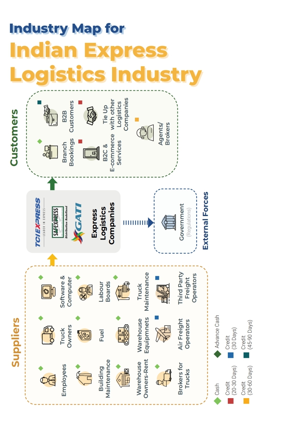 🚛 Mapping the Indian Express Logistics Industry 📦✨ From suppliers providing trucks, fuel and warehouses to customers like B2B clients and e-commerce businesses the logistics industry keeps India moving! 🔄💼 Governed by regulations, it ensures sea
