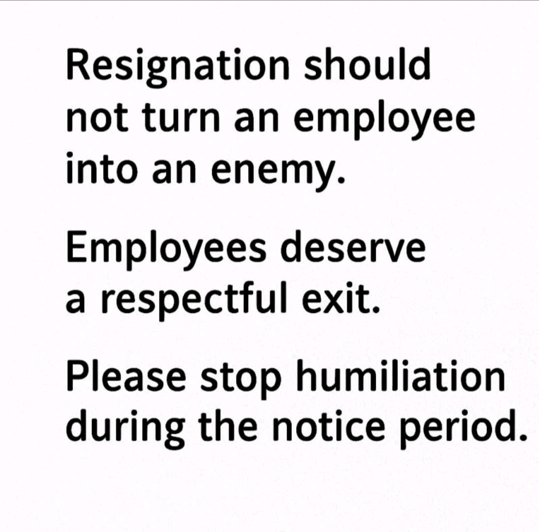 Resignation is not betrayal. Turning an employee into an enemy during their notice period reflects weak leadership, not loyalty. Every professional deserves a respectful exit — stop humiliation, start showing maturity. ✊" #ToxicWorkCulture #RespectEmployees #LeadershipFail #WorkplaceDignity #NoticePeriod #RespectAtWork #HRLeadership #EmployeeRights