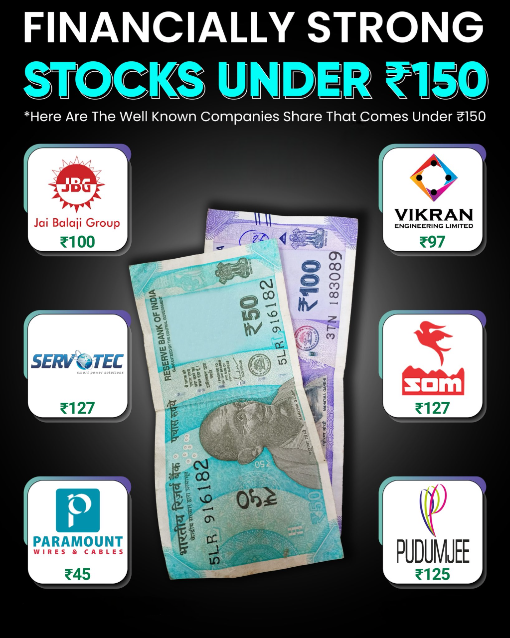 Top Financially Strong Stocks Under ₹150! Looking for budget-friendly yet powerful investments? Here are some well-known companies trading under ₹150 that could strengthen your portfolio! 🔥 Stocks to Watch: 💎 Jai Balaji Group – ₹100 ⚙️ Vikran