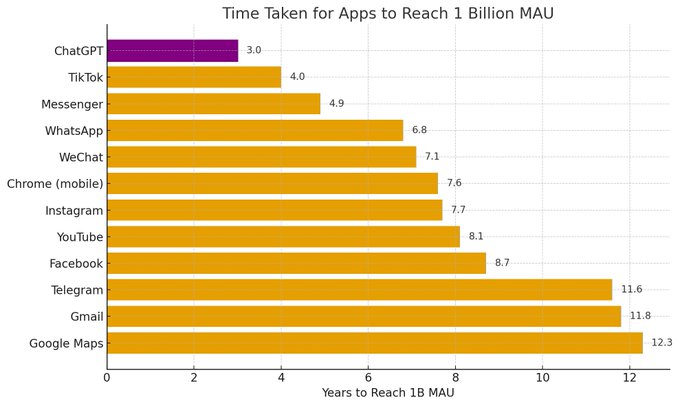 Time to reach 1bn MAU for some apps: Chatgpt ~3 years TikTok ~ 4 years WhatsApp ~ 7 years Instagram ~ 8 years Facebook ~ 8.5 years Also X, LinkedIn and Snapchat haven’t done it yet.
