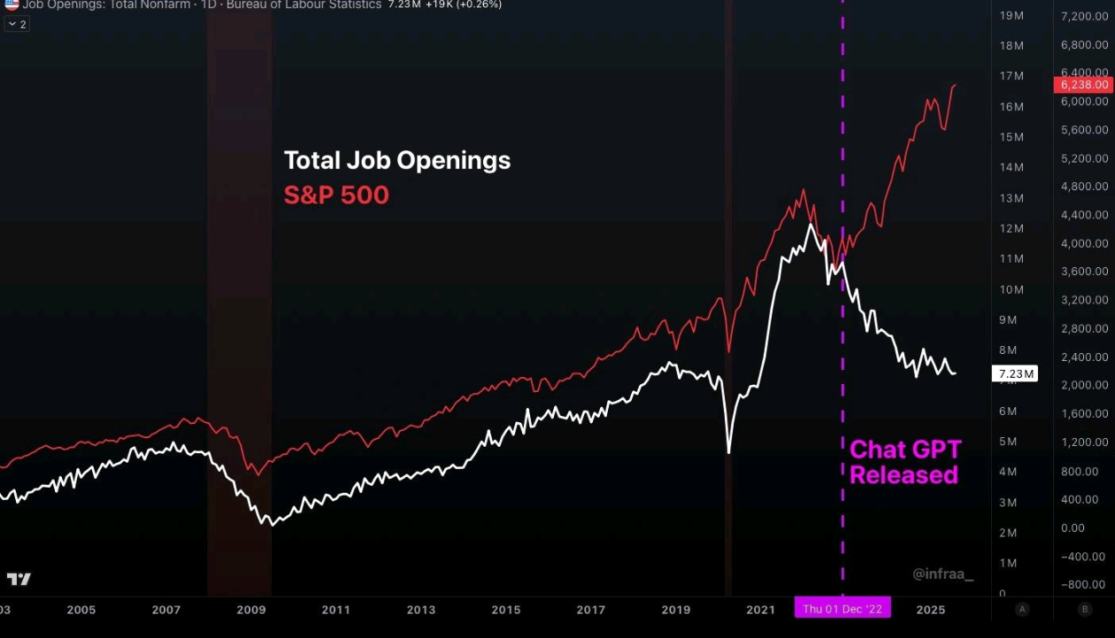 Them: Al won't displace jobs This chart: It already has Figure out your way to work with Al urgently.
