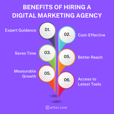 Benefits of Hiring a Digital Marketing Agency for SEO - Eflot Hiring a digital marketing agency for SEO helps businesses improve their online visibility and attract more visitors to their website. These agencies have experts who know the latest SEO techniques and tools, saving you time and effort. They can create strategies to boost search rankings, drive targeted traffic, and increase leads or sales. Overall, they make online marketing more efficient and effective for growth. https://eflot.com/digital-marketing-agency-in-bangalore