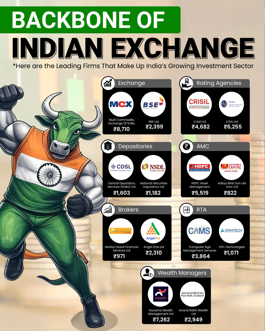 The Backbone of Indian Exchange! These companies power India’s growing financial sector. from Exchanges and Depositories to Brokers and Wealth Managers! They’re the real heroes behind the rise of the Indian stock market! 🔥