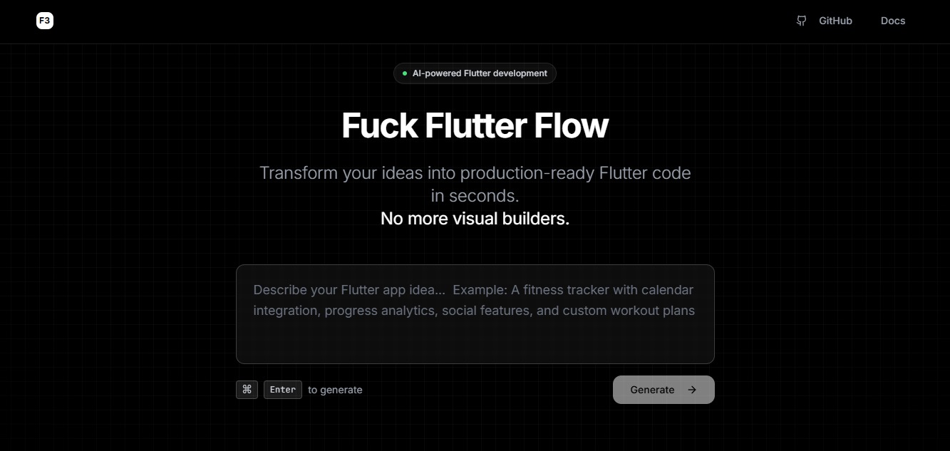 we've started working on F3 a no code powered by AI that turns text prompt into full flutter websites. vision is simple you describe what you want --->it generate clean, production ready flutter code ---> instant website we have just launched small waitlist for early access, check it out here : https://f3-waitlisti.vercel.app/