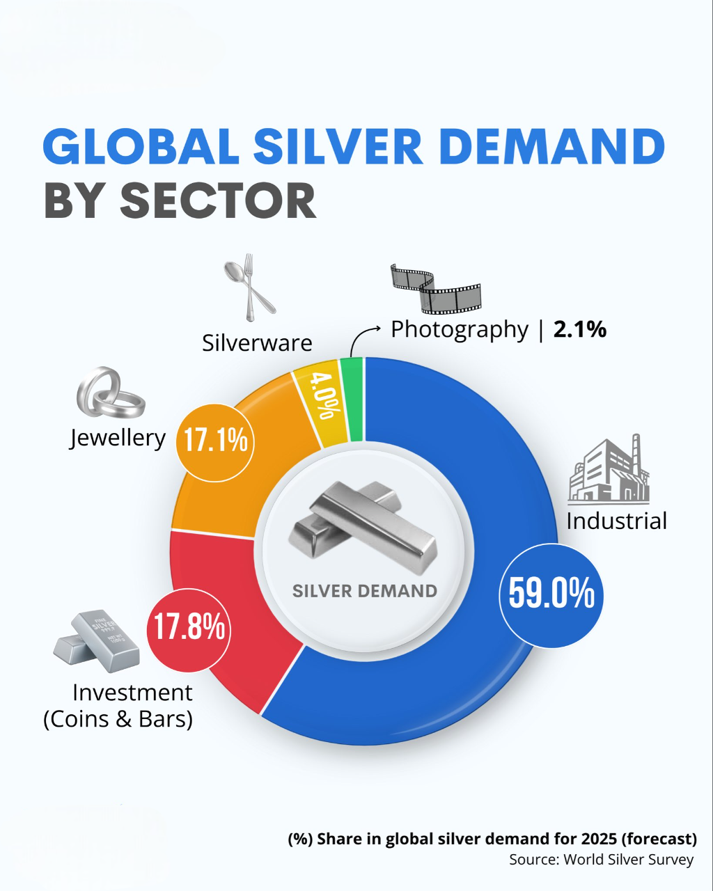 Global Silver Demand 2025 Forecast! Did you know? 59% of silver goes to industrial use — not jewellery! Investments & ornaments make up the rest.