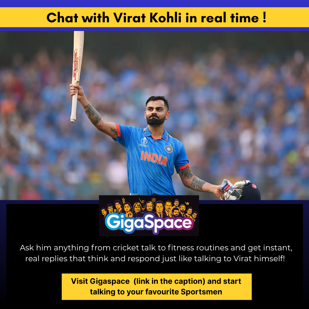 Ask Virat Kohli โ โWhat keeps you motivated to give your 100% every match?โ ๐ Get real, authentic responses that mirror his mindset, passion, and discipline. Chat now on https://gigaspace.org/login