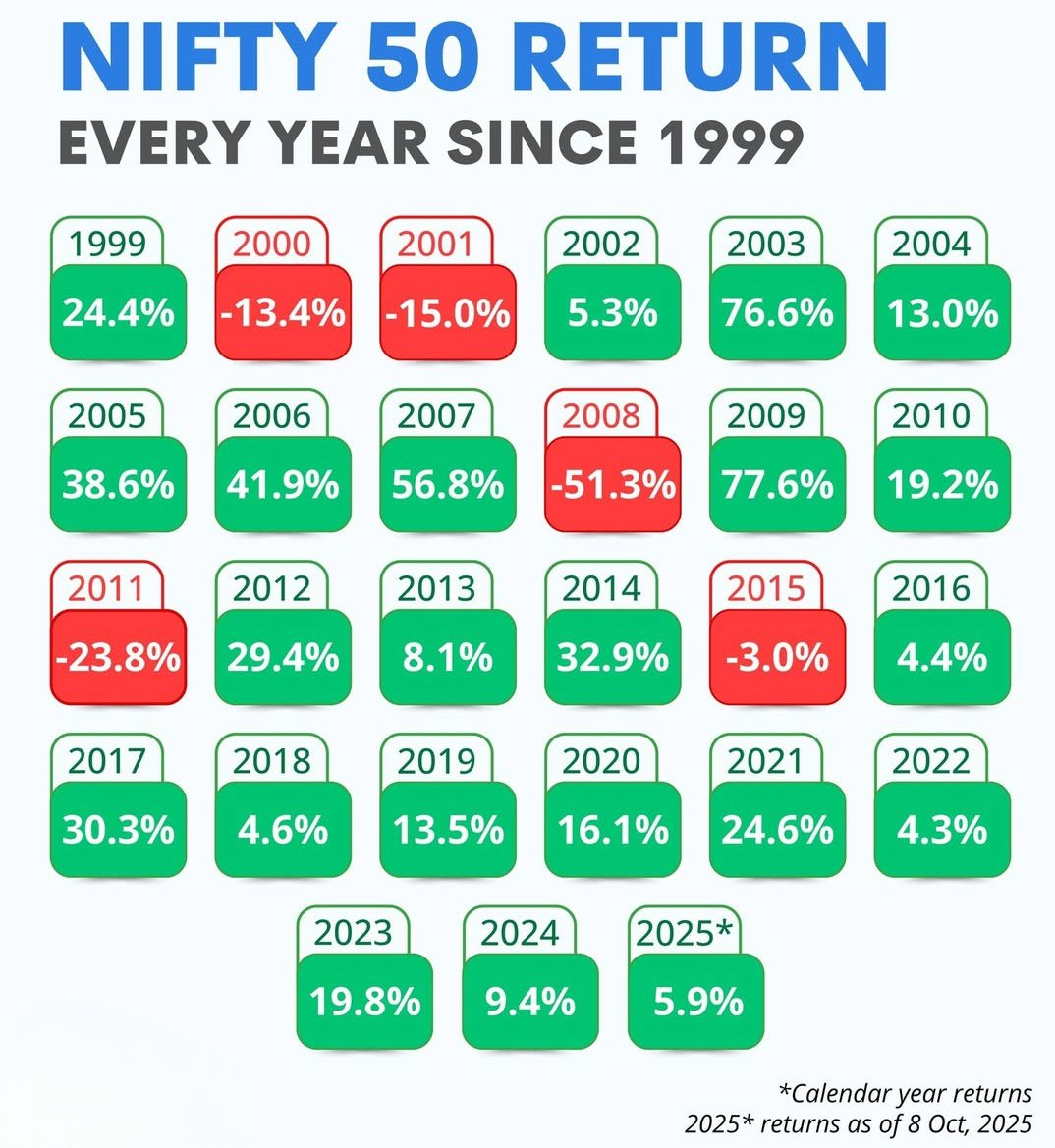Nifty 50 Returns Since 1999! From 💥 +77.6% in 2009 to 😱 -51.3% in 2008 — what a ride! Consistency pays in the long run 💪