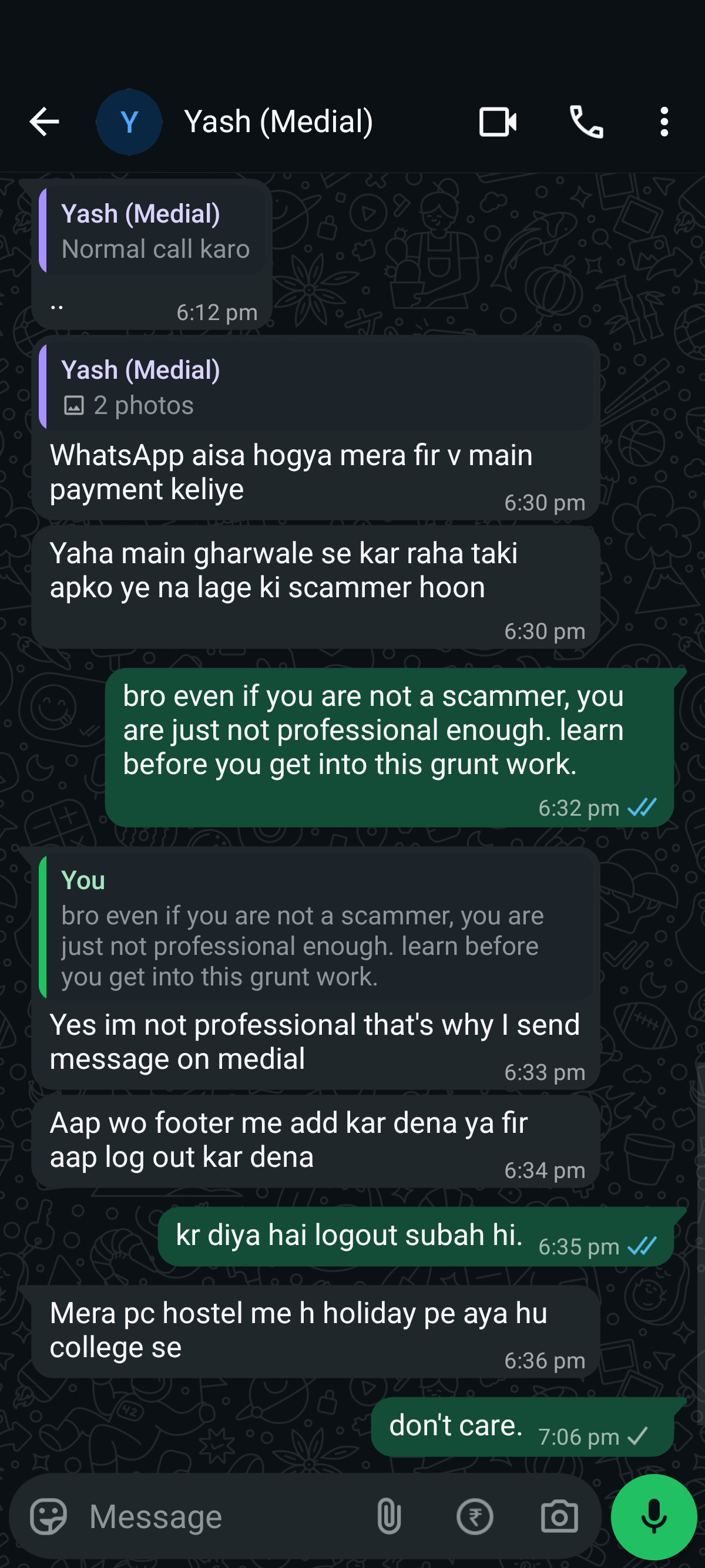 2 days ago, I stumbled upon this guy on medial offering a freelance wordpress project. now Iโve been doing freelance for a while, mostly on custom-coded websites, but I wanted to learn wordpress too, so I thought why not. he was paying just 1k, but money was never the goal, I just wanted to explore. so I took it as a small side project for 2 days. the communication was messy, we didnโt really understand each other, but I still stayed calm as long as he didnโt interfere with my work. 2 days later, the website was done. clean, functional, client satisfied. and hereโs where the real story begins. turns out, this guy wasnโt even the actual client. he had taken the work from someone else and passed it to me. Iโm 100% sure he was keeping 70โ80% of the payout just for forwarding the message. no contribution, no skills, just vibes. then came the final straw. he delayed the payment first, which I could still ignore, but then he asked me to give โcreditsโ to some Sonu Kumar in the website footer, for the work I did. that one line flipped my mood completely. I backed off instantly. didnโt even take the money. because credibility is not what I sell. and honestly, itโs just frustrating how full the Indian freelancing space is with people like this, middlemen who act like theyโre running the show when in reality, they wouldnโt last a week without the people who actually build things. itโs not the first time Iโve seen this, probably not the last. but if youโre one of those people reading this, seriouslyโฆ grow up. earn it, donโt fake it.
