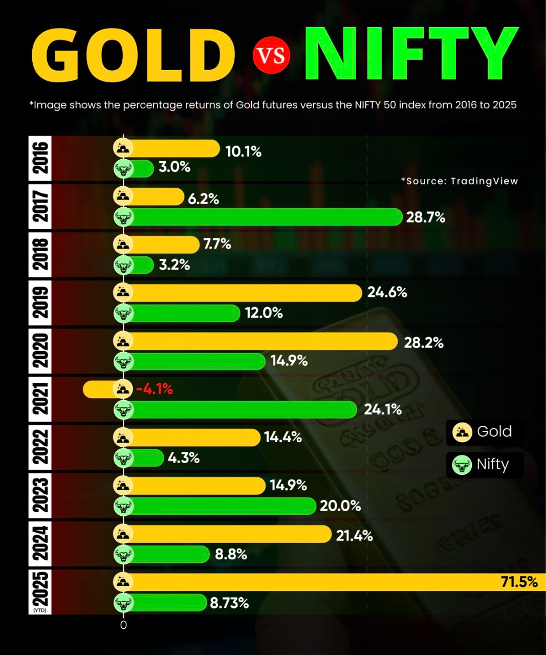 GOLD vs NIFTY – The Ultimate Showdown! From 2016 to 2025, both have had their moments… but can you guess who’s shining brighter this year? 🏅 Gold: +71.5% (2025 YTD 🔥) 🐂 Nifty: +8.73% Which one’s in your portfolio?