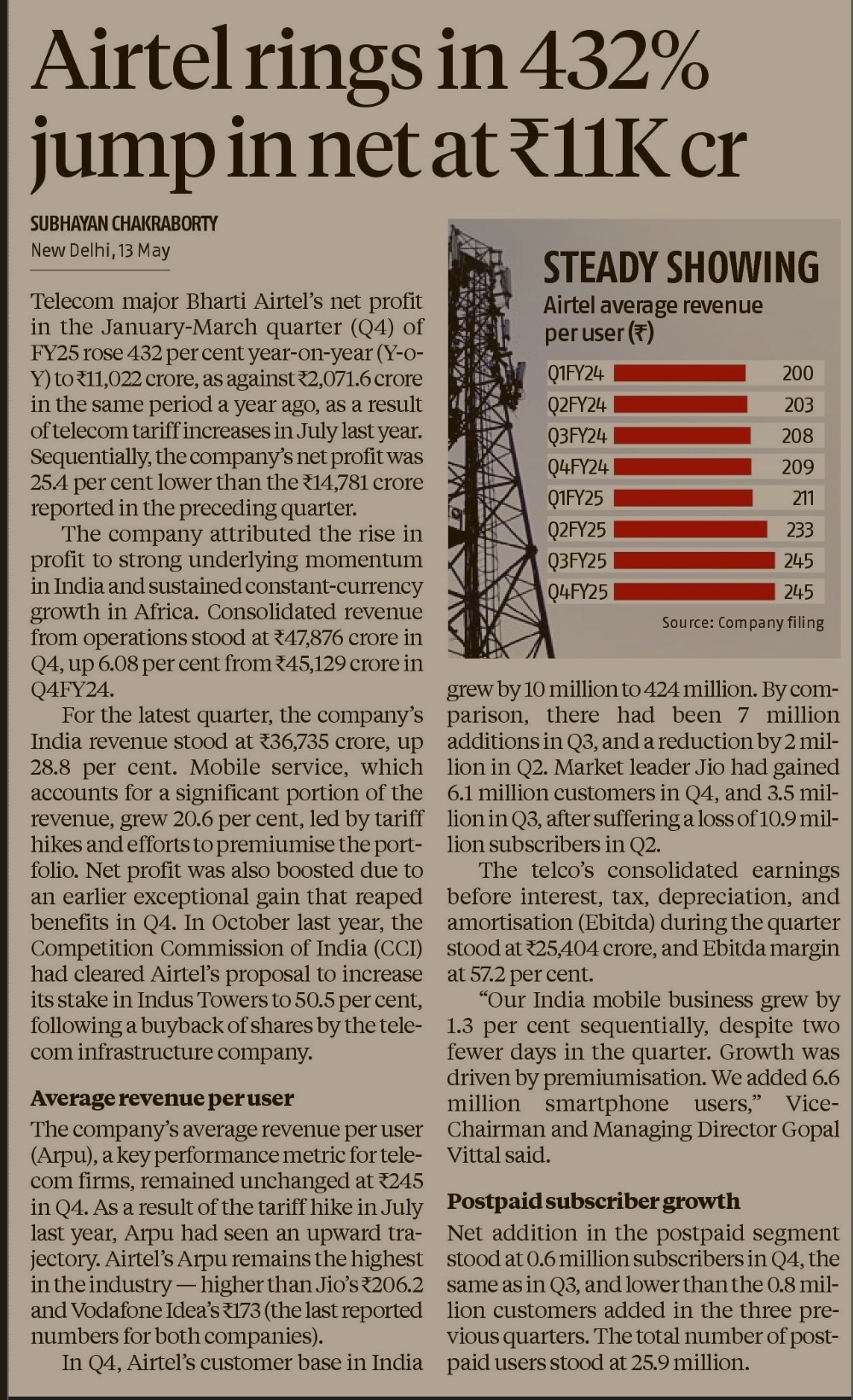 "Airtel Dials into Profit Paradise with a Whopping โน11K Cr Ring!" Whoa, Airtel just dialed up some serious digits! A 432% profit jump to โน11,000 croreโthat's not just growth, thatโs supercharged telecom hustle. Tariff hikes, ARPU (โน245!) climbing li