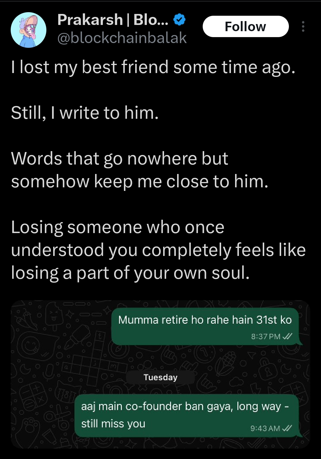 🕊️ “Aaj mai co-founder ban gaya.” Even in silence, some friendships speak louder than words. Prakarsh Pathak’s WhatsApp message to his late best friend - sent with no expectation of reply - has become a quiet anthem of grief, love, and legacy. He wrote: “aaj mai co-founder ban gaya… long way, still miss you.” This isn’t just a message - it’s a tribute to friendship, love, and the unbreakable bond that even time and distance can’t fade. 💔✨