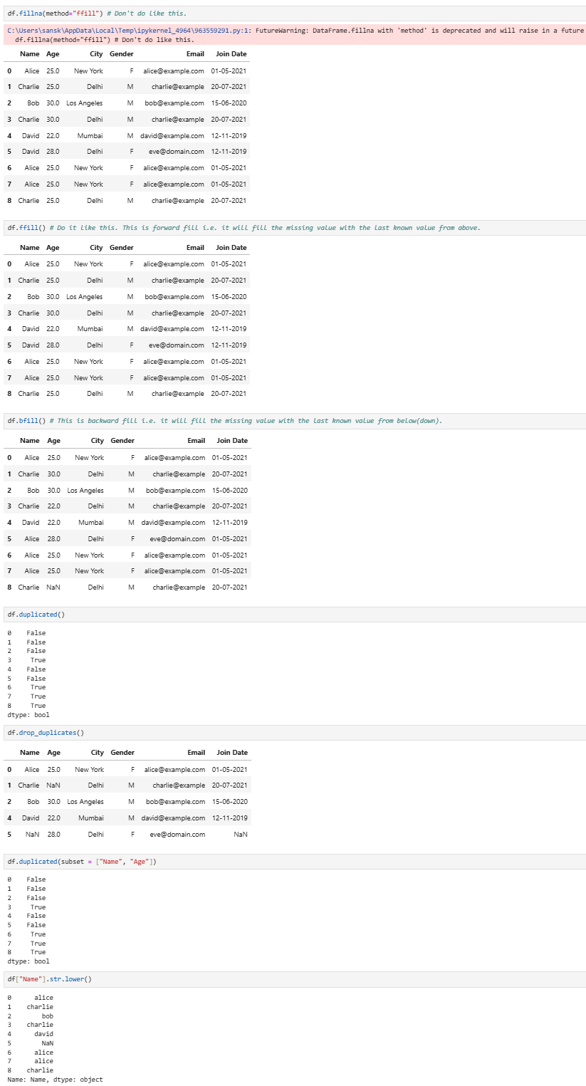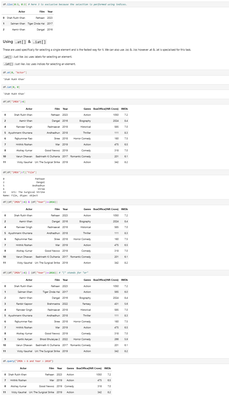 Day 12 of learning data science as a beginner. Topic: data selection and filtering As pandas is created for the purpose of data analysis it offers some significant functions for selecting and filtering some of which are. .loc: this finds the row by label name which can be whatever (example: abc, roman numbers, normal numbers(natural + whole) etc.). .iloc: this finds the row by index i.e. it doesn't care about the label name it will search only by index positions i.e. 0, 1, 2... These .loc and .iloc functions can be used for various purposes like selecting a particular cell or for slicing also there are several other useful functions like .at and .iat which are used specifically for locating and selecting an element. we can also use various conditions for analyzing our data for example. df[df["IMDb"]>7]["Film"] which means give the name of films whose IMDb ratings is greater than 7. we can also use similar or more advanced conditioning based on our need and data to be analyzed.