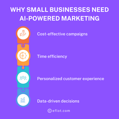 Why Small Businesses Need AI-Powered Marketing - Eflot AI-powered marketing helps small businesses grow faster by making their marketing smarter and more efficient. It allows them to understand customer behavior, personalize ads, and automate tasks like email campaigns and social media posting. With AI, small businesses can compete with larger companies by saving time, reducing costs, and making better decisions based on real data. https://eflot.com/digital-marketing-agency-in-bangalore