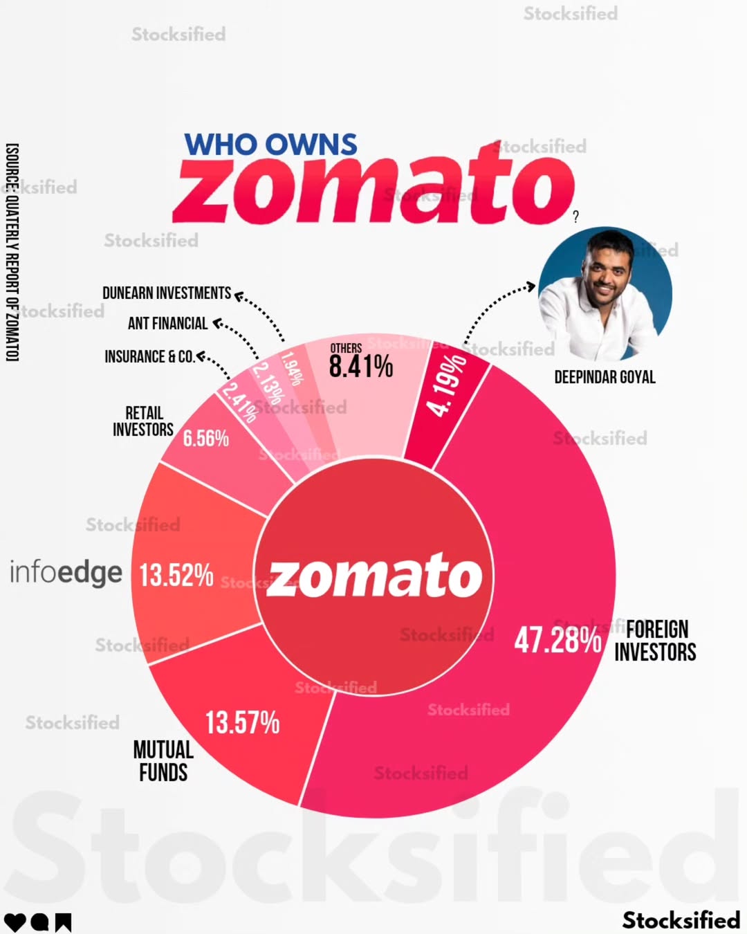 ๐ก Who Owns Zomato? ๐ง Hereโs a breakdown of Zomatoโs ownership structure: ๐ 47.28% โ Foreign Investors ๐ 13.57% โ Mutual Funds ๐ 13.52% โ Info Edge ๐ 8.41% โ Others ๐ 6.56% โ Retail Investors ๐ 4.19% โ Deepinder Goyal (Founder) ๐ 6.23% โ Ins