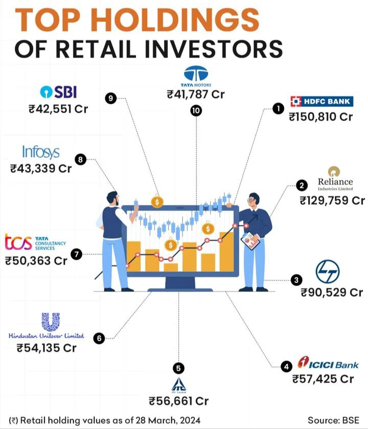 Retail investors are betting big on these companies! ๐ฅ๐ ๐ฆ HDFC Bank leads with a massive โน1.5 Lakh Cr retail holding. ๐ญ Reliance Industries follows with โน1.29 Lakh Cr, while L&T secures third place at โน90,529 Cr. ๐ก Are you investing in any of