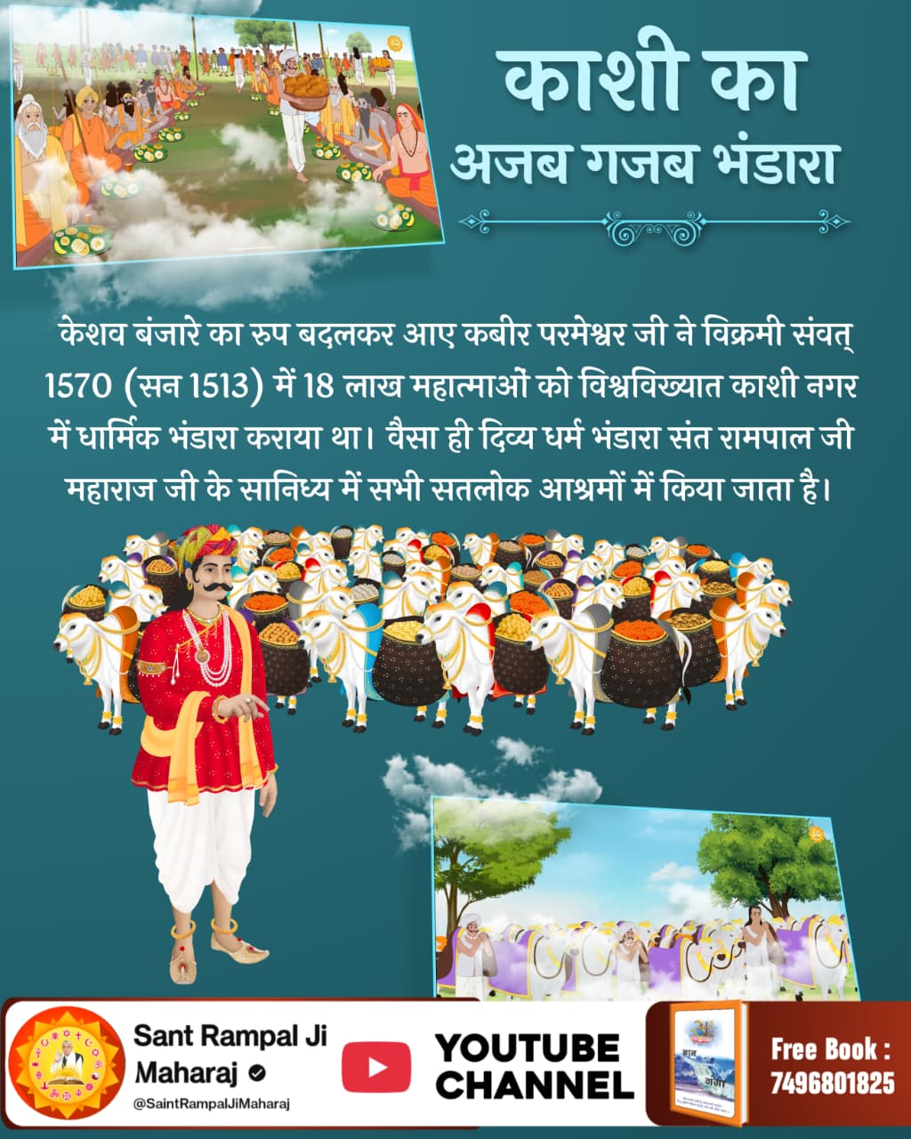 सन 1513 में कबीर परमेश्वर केशव बंजारे का वेश धारण करके अमर लोक यानी सतलोक से नौ लाख बोरी में भंडारा सामग्री बैलों पर रखकर व एक लाख सेवादारों के साथ कांशी नगर आए। केशव बंजारे रूप में आए परमात्मा ने काशी नगर में अद्भुत भंडारे का आयोजन किया। चाहे कितना भी खाओ कोई रोक टोक नहीं, वहा मिठाई, लड्डू, जलेबी, चावल, खीर, हलवा, आदि कढ़ाहो के ढेर की ढेर लगे थे, मानो कुबेर का भंडार ही धरती पर आ गया हो। #सन1513_का_दिव्य_काशीभंडारा #DivyaDharmaYagyaDiwas #दिव्य_धर्म_यज्ञ_दिवस #miracles #Bhandara #feast #langar #trending #photooftheday #kashi #banarasi #UP #kabir #KabirisGod #SantRampalJiMaharaj #SatlokAshram #trendingreels #trend #AnnapurnaMuhim #SaNewsChannel ✰वेदों के अनुसार वो परमात्मा कौन हैं जिनकी साधना से सारे पाप नष्ट हो जाते हैं?✰ अवश्य पढ़ें पवित्र सद्ग्रंथों पर आधारित संत रामपाल जी महाराज द्वारा लिखित पुस्तक *ज्ञान गंगा*। निःशुल्क पुस्तक प्राप्त करने हेतु अपना नाम, पूरा पता, और मोबाइल नंबर हमें व्हाट्सएप करें : +91 7496801825