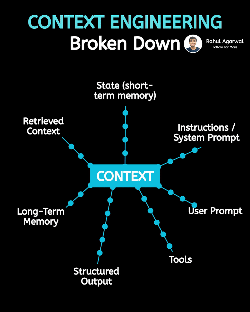 What exactly is Context Engineering in AI? A quick 2-minute simple breakdown for you. ๐๐ถ๐ฟ๐๐, ๐ต๐ผ๐ ๐ถ๐ ๐ถ๐ ๐ฑ๐ถ๐ณ๐ณ๐ฒ๐ฟ๐ฒ๐ป๐ ๐ณ๐ฟ๐ผ๐บ ๐ฃ๐ฟ๐ผ๐บ๐ฝ๐ ๐๐ป๐ด๐ถ๐ป๐ฒ๐ฒ๐ฟ๐ถ๐ป๐ด? โข ๐ฃ๐ฟ๐ผ๐บ๐ฝ๐ ๐๐ป๐ด๐ถ๐ป๐ฒ๐ฒ๐ฟ๐ถ๐ป๐ด = crafting a single clever input to guide the model. โข ๐๐ผ๐ป๐๐ฒ๐ ๐ ๐๐ป๐ด๐ถ๐ป๐ฒ๐ฒ๐ฟ๐ถ๐ป๐ด = designing the entire environment of information (memory, docs, tools, prompts) so the model always has the right context to work with. These are the steps: 1. ๐๐ฒ๐ฐ๐ถ๐ฑ๐ฒ ๐๐ต๐ฒ ๐ด๐ผ๐ฎ๐น (๐ฏ๐ฒ๐ณ๐ผ๐ฟ๐ฒ ๐ฎ๐ป๐๐๐ต๐ถ๐ป๐ด) โข Ask yourself: ๐๐ฉ๐ข๐ต ๐ฅ๐ฐ ๐ ๐ธ๐ข๐ฏ๐ต ๐ต๐ฉ๐ฆ ๐ฎ๐ฐ๐ฅ๐ฆ๐ญ ๐ต๐ฐ ๐ฑ๐ณ๐ฐ๐ฅ๐ถ๐ค๐ฆ? (e.g., a short email, a JSON object, a lesson plan). 2. ๐๐ป๐๐๐ฟ๐๐ฐ๐๐ถ๐ผ๐ป๐ / ๐ฆ๐๐๐๐ฒ๐บ ๐ฃ๐ฟ๐ผ๐บ๐ฝ๐ (๐ฟ๐ถ๐ด๐ต๐-๐๐ผ๐ฝ) โข These are the modelโs rules and persona. Think of it as: โYou are X, follow Y style and constraints.โ 3. ๐จ๐๐ฒ๐ฟ ๐ฃ๐ฟ๐ผ๐บ๐ฝ๐ (๐ฟ๐ถ๐ด๐ต๐-๐บ๐ถ๐ฑ๐ฑ๐น๐ฒ)โข This is the immediate request or question from the user. It tells the model the task. 4. ๐ง๐ผ๐ผ๐น๐ (๐ฟ๐ถ๐ด๐ต๐-๐ฏ๐ผ๐๐๐ผ๐บ)โข External helpers the model can call (search, calculator, calendar, API). 5. ๐ฆ๐๐ฟ๐๐ฐ๐๐๐ฟ๐ฒ๐ฑ ๐ข๐๐๐ฝ๐๐ (๐ฏ๐ผ๐๐๐ผ๐บ)โข A requested format for the result so itโs machine-friendly (JSON, CSV, bullet list). 6. ๐๐ผ๐ป๐ด-๐ง๐ฒ๐ฟ๐บ ๐ ๐ฒ๐บ๐ผ๐ฟ๐ (๐น๐ฒ๐ณ๐-๐ฏ๐ผ๐๐๐ผ๐บ)โข Stable facts about the user, company, style preferences, or past interactions you want the model to remember over many sessions. 7. ๐ฅ๐ฒ๐๐ฟ๐ถ๐ฒ๐๐ฒ๐ฑ ๐๐ผ๐ป๐๐ฒ๐ ๐ (๐น๐ฒ๐ณ๐-๐บ๐ถ๐ฑ๐ฑ๐น๐ฒ)โข Documents or snippets pulled in just for this query (knowledge base, product docs, previous chat lines). 8. ๐ฆ๐๐ฎ๐๐ฒ (๐๐ต๐ผ๐ฟ๐-๐๐ฒ๐ฟ๐บ ๐บ๐ฒ๐บ๐ผ๐ฟ๐) (๐๐ผ๐ฝ)โข Whatโs happening ๐ณ๐ช๐จ๐ฉ๐ต ๐ฏ๐ฐ๐ธ in the conversation โ recent messages, variables, or temporary flags. ๐๐ผ๐ ๐๐ต๐ฒ๐๐ฒ ๐ฝ๐ฎ๐ฟ๐๐ ๐๐ผ๐ฟ๐ธ ๐๐ผ๐ด๐ฒ๐๐ต๐ฒ๐ฟ (๐ณ๐น๐ผ๐) 1. System prompt sets the rules first (how the model should behave). 2. Long-term memory and retrieved context provide background facts the model should use. 3. State supplies immediate conversation history and live variables. 4. User prompt gives the specific task. 5. The model can call Tools if it needs real-time info or actions. 6. The model returns the answer, ideally in the Structured Output format you asked for. โ Repost for others who want to understand Context Engineering.